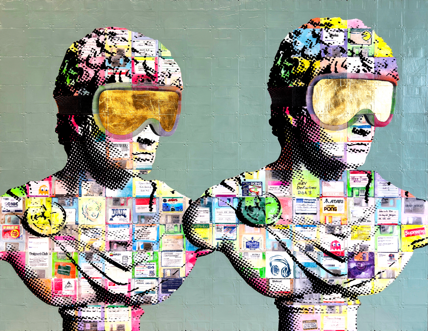 Oil, Enamel, Screen print, Gold leaf & Recycled Computer Floppy Disk on wood Panel