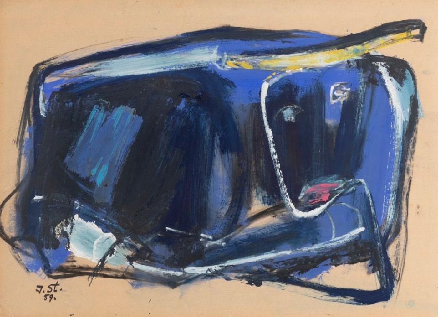 Balanced between figuration and pure gesture, the painting reflects a moment when artists working in and around New York were pushing abstraction toward more structural and iconic forms while retaining emotional immediacy. Signed and dated “J. St. '59” in the lower left, the work reads as a confident studio piece from the height of the postwar avant-garde.