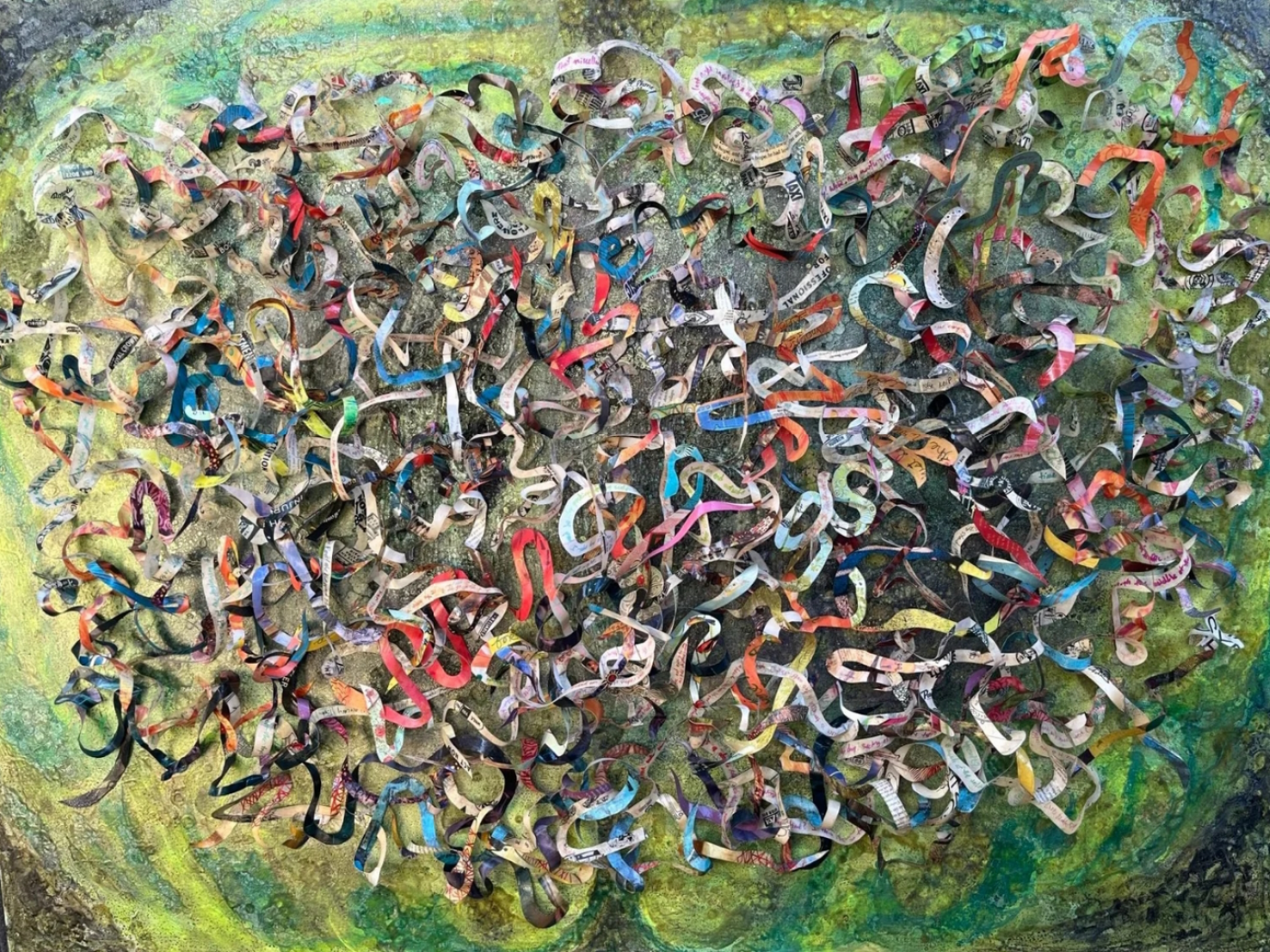 Shellacked paper, paint, metallic alcohol inks on canvas