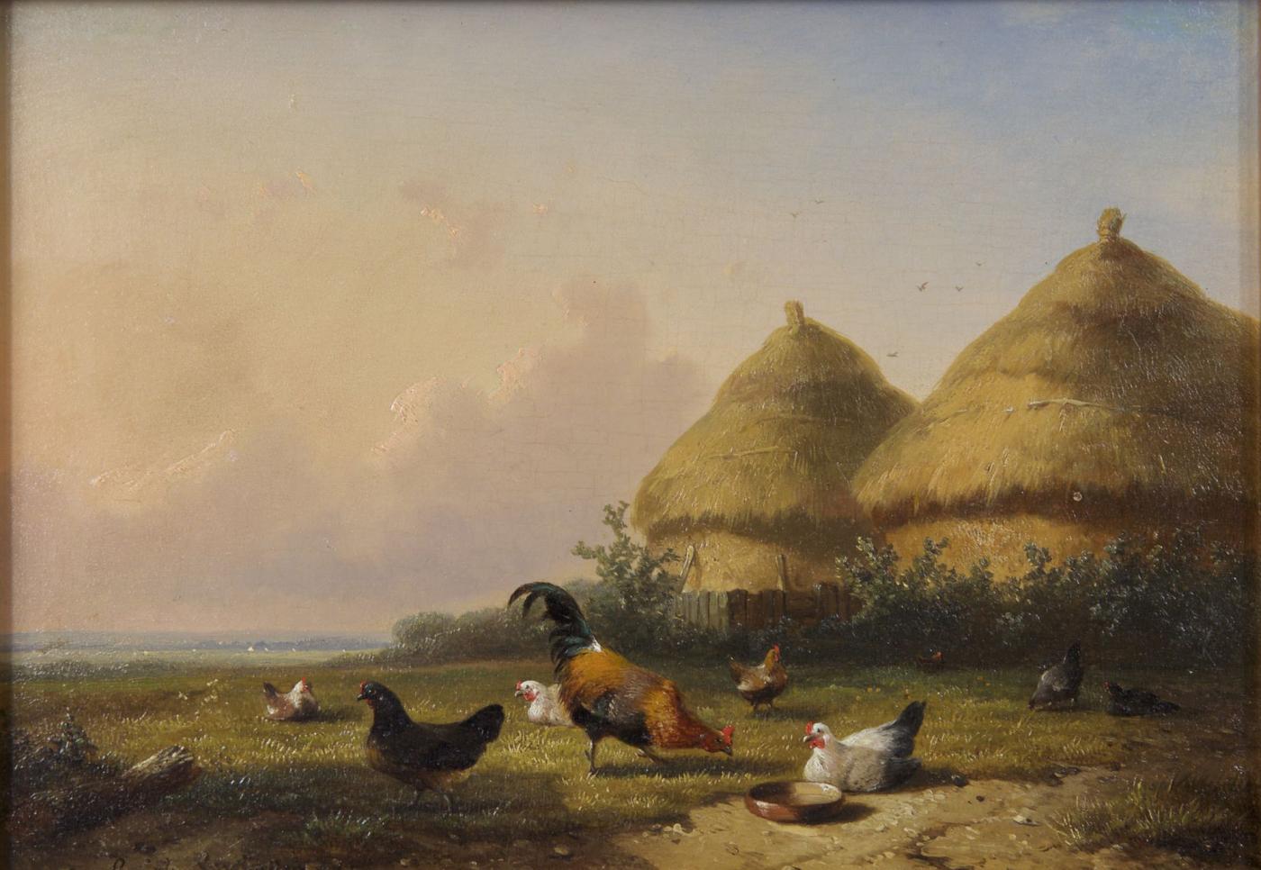 A crisp and vibrant scene, this colorful little work depicts a plethora of fowl pecking around the green grasses of a farm yard for bugs and seeds under clear skies in summer. Two tidy haystacks are positioned behind an old wooden fence. Each bird is painted with unusual attention to detail, the variety of colors in each bird’s feather makeup being notable and admirable. The shadow work is highly technical with a perfect gradient between shadows and full sunlight. Cornelis walks a fine line between realism and idealism in his nostalgic works, but his ability to navigate this effectively is what set his works apart from his contemporaries. The present example is signed in the lower left corner and retains an old label on the back of the panel. It is housed in a contemporary gilded frame.