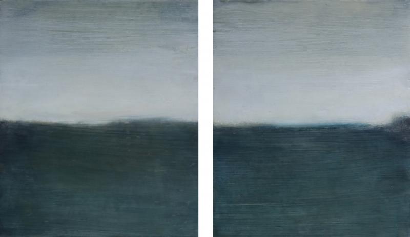 This work is from a series of formal trifold compositions of quiet horizontal abstraction is based in the Venetian tradition of “colore” (color as the basis of art) producing a Depiction of Atmosphere (the Unseen Air) as both subject and object. Here the subtle blue tones produce a rich density of optical resonance to capture an atmosphere of diffused light.