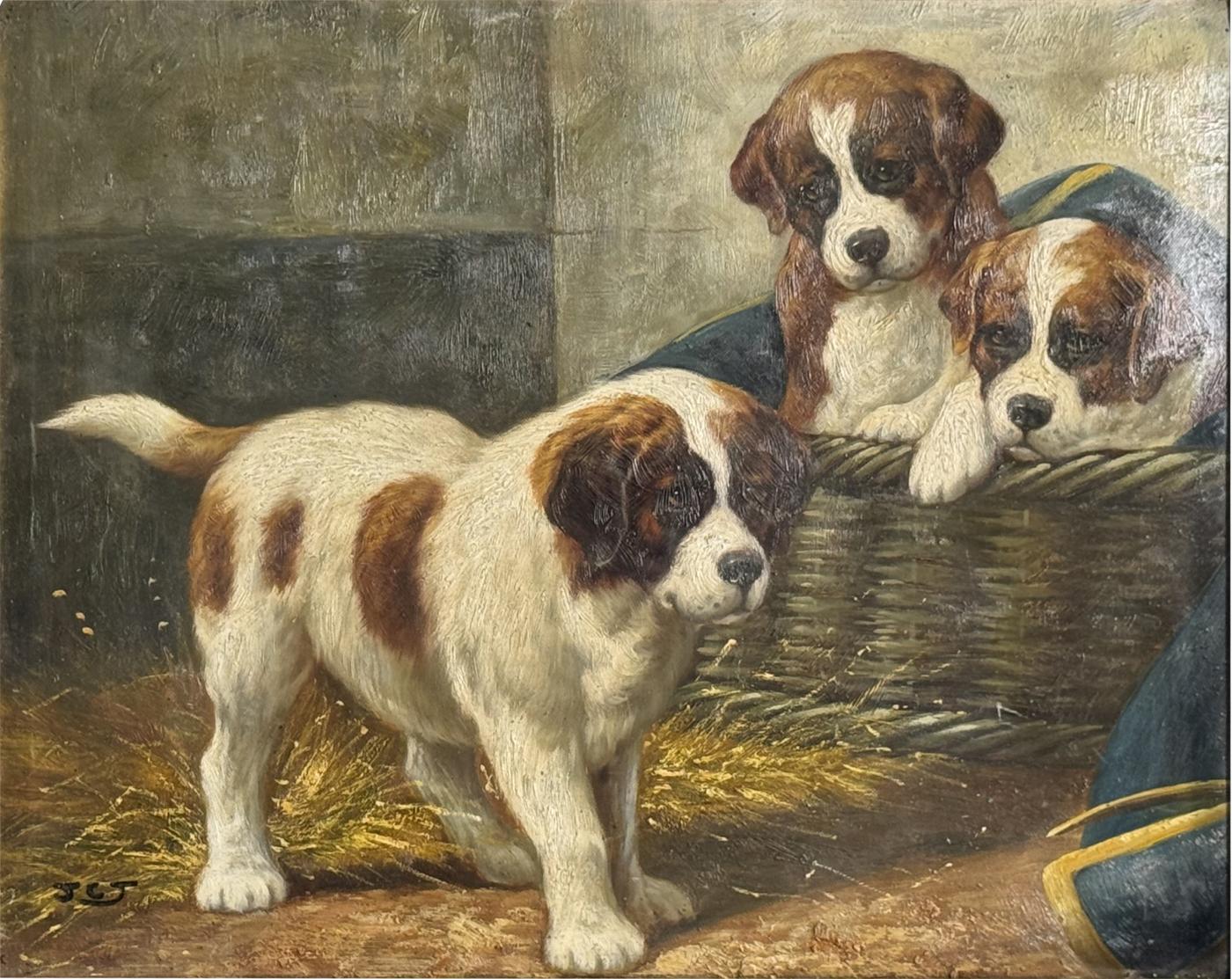 SIGNED VIBRANT ANTIQUE TRIO OF SAINT BERNARD PUPPIES AND BASKET OIL PAINTING