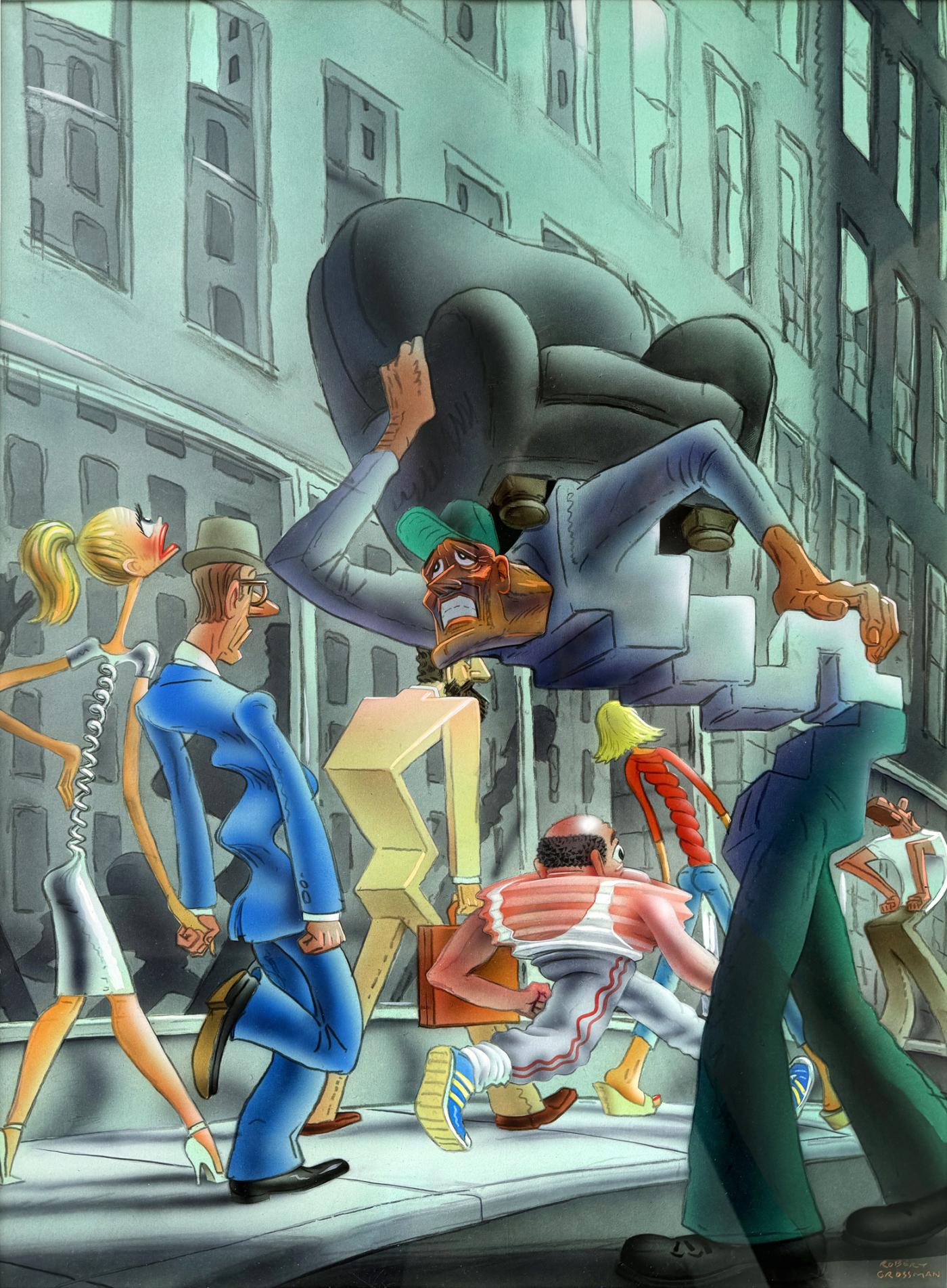 Throughout his career, Grossman employed an airbrush (he favored compressed air over piston) in order to render the sculptural forms which are his paintings' most readily identified characteristic. Since with an airbrush a skilled user may lay in areas of shadow and light with either crisp or soft edges, the shapes possess a high degree of visual verisimilitude. Grossman is sometimes credited with spearheading a resurgence of the tool in illustration; for decades it had been used primarily for photo retouching. Pete Hamill writing in the international journal of visual communication Graphis[11][12] and Steven Heller in Innovators of American Illustration note that Grossman's approach to the airbrush has been widely imitated. His "mordant wit" is never duplicated, adds Heller.[13]