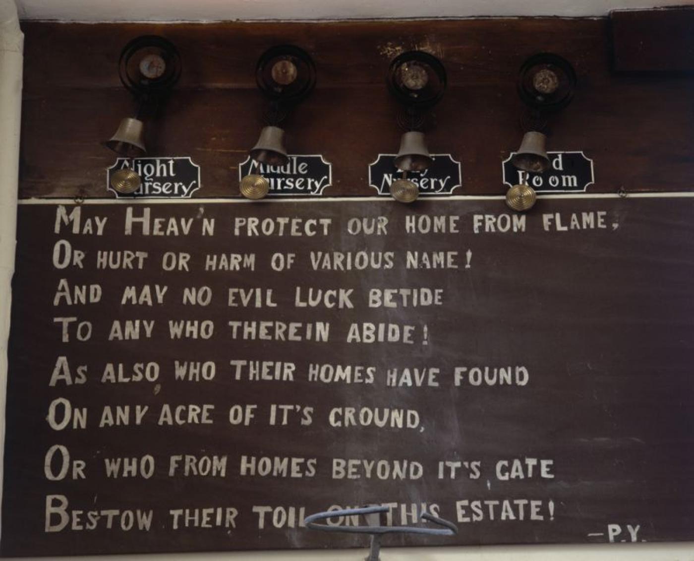 A poem under the nursery bells at Erdigg House in Wales, 1990s. The first lines read ‘May heav’n protect our home from flame, or hurt or harm of various name!'(Photo By Christopher Simon Sykes)