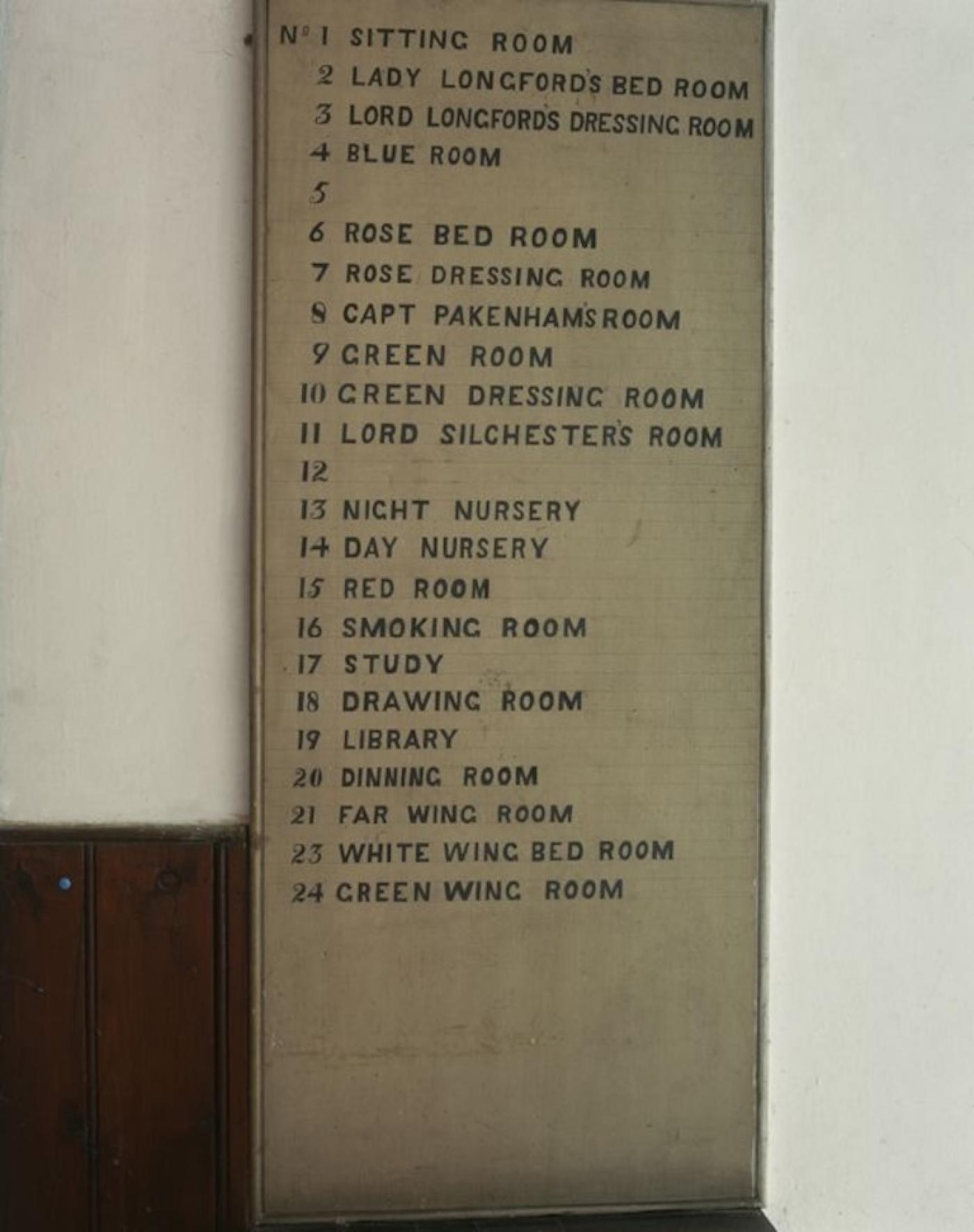 A list of the rooms in Tullynally Castle, County Westmeath, including Lady Longford’s bedroom and Lord Longford’s dressing room, 1990s.(Photo By Christopher Simon Sykes)