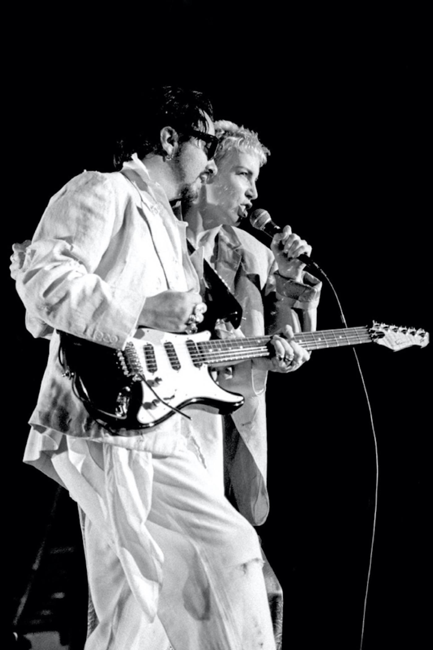 Musicians Annie Lennox and Dave Stewart, the band Eurythmics performing on stage at Wembley Stadium, London, September 1989.