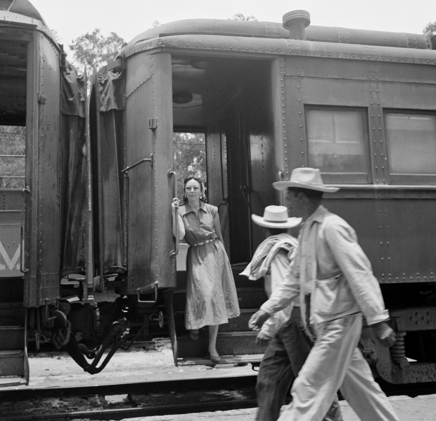 A women tourist poses on a train in Patzcuaro, Mexico, 1962. Photo by Earl Leaf/The Getty Archive London England -