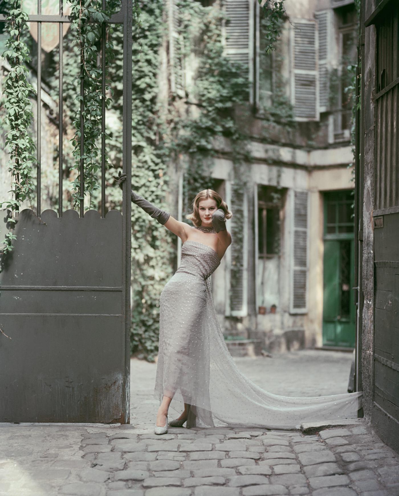 Courtyard Dior Gray Chiffon -- Dorothy Tristan in Dior's Soiree Etoilee smash hit gray chiffon evening dress. Photographed in a Paris courtyard for the September 1955 issue of Life. | Medium: Pigment print on Hahnemϋhle photo rag paper | Sizes: 17" x 11" = $ 1400 | 22" x 17" = $ 2000 | 36" x 24" = $ 3200