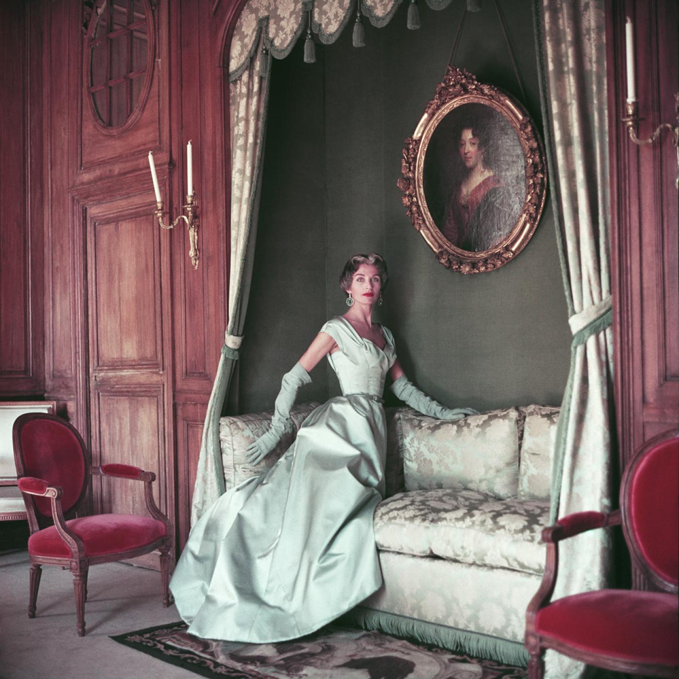 Jane in Blue Fath on Daybed - Photographed in 1953 at the French country estate, Corbeville, Jane Sprague models a ball gown by Fath. | Medium: Pigment print on Hahnemϋhle photo rag paper | Sizes: 17" x 11" = $ 1100 | 22" x 17" = $ 1500 | 36" x 24" = $ 2500