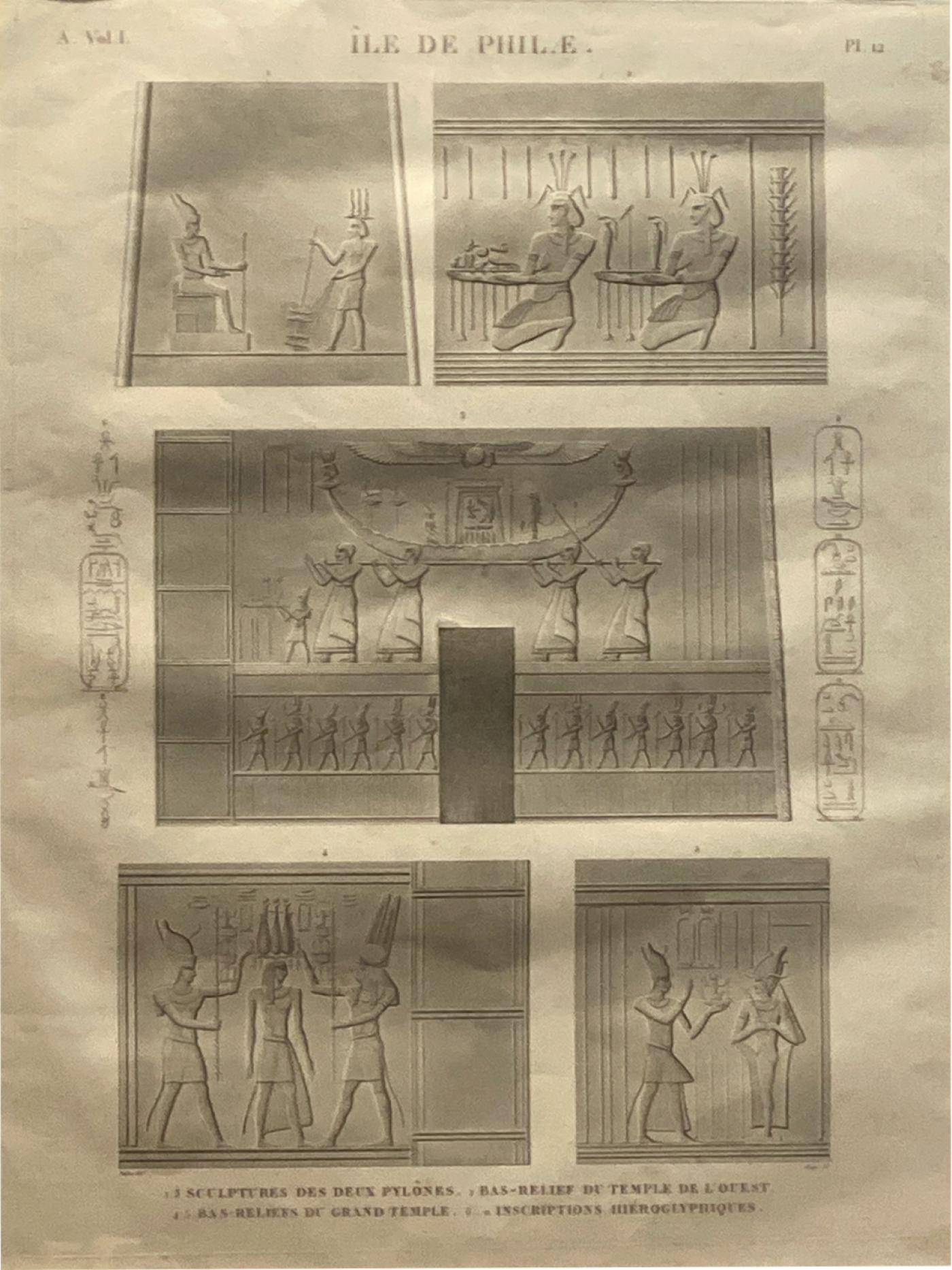 An early 19th Century French engraving from the "Description de l'Egypte", printed after Napoleon's expedition into Egypt, circa 1810. Framed and matted. This engraving features a doorway and decorative wall carvings. Framed and matted. We currently have 9 of these "Description de l'Egypte" framed engravings. Priced Individually. Please message us with any questions about this series.
