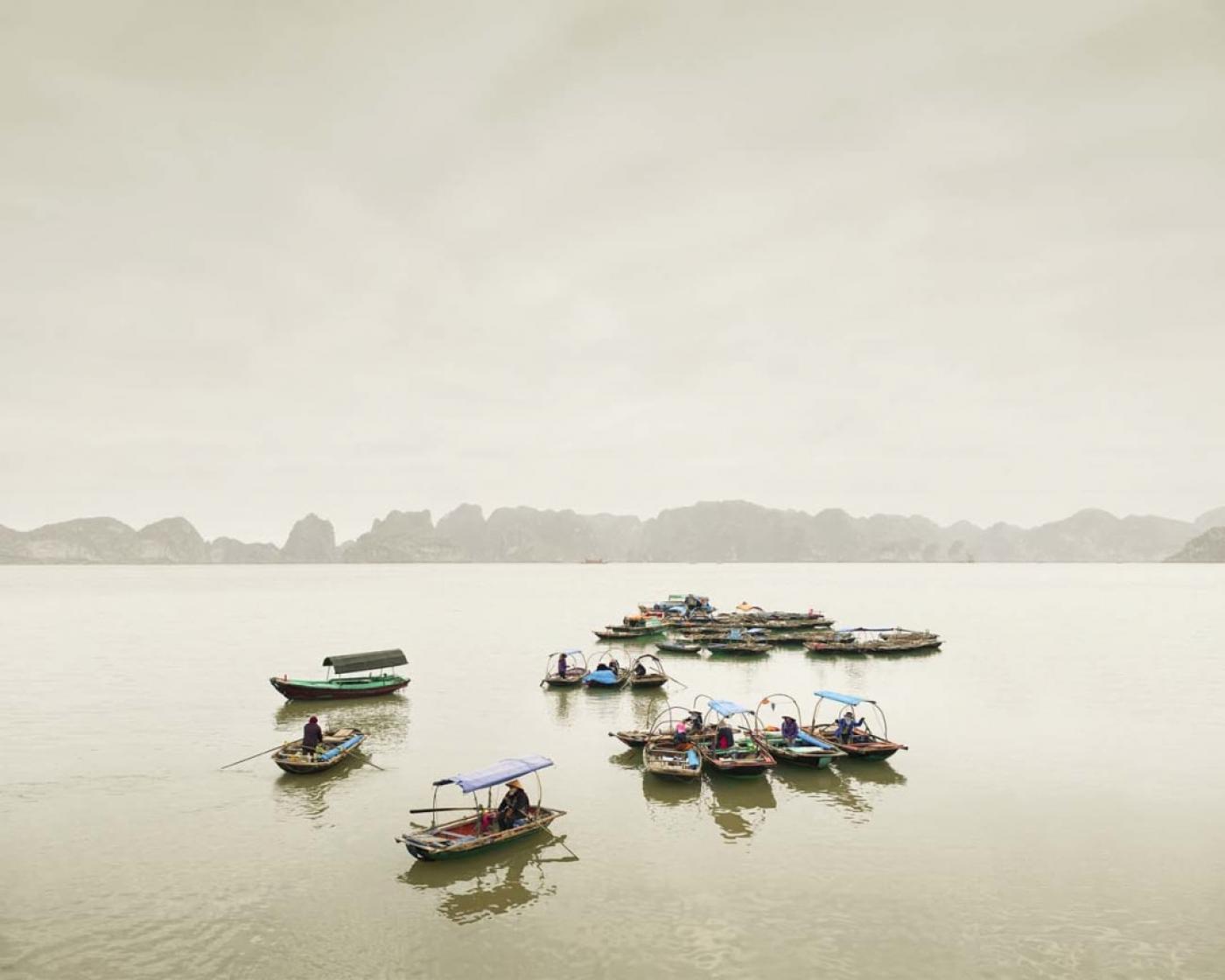 "Water Taxies, Vịnh Hạ Long, Vietnam, 2012. Vietnam is one of my favourite places to travel and right now top of my list to visit again once it’s safe to do so. Back when Cát Bà Island had a large floating village, these woman would wait by the shore to take residents back and forth between the island and their homes. This was shot handled Weegee -style, with my Linhof Super Technika. Not very practical by 2020 standards but fun when it worked!"