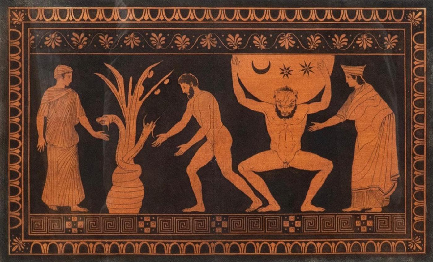 Print size: 15 inches by 10 inches. Lord Hamiltons Ancient Vases. Number 94. Johann Tischbein, Naples , Italy. The scene depicts a scene from Greek Mythology, specifically one of the Labors of Heracles { Hercules ]. In a fine quality water gilt frame.