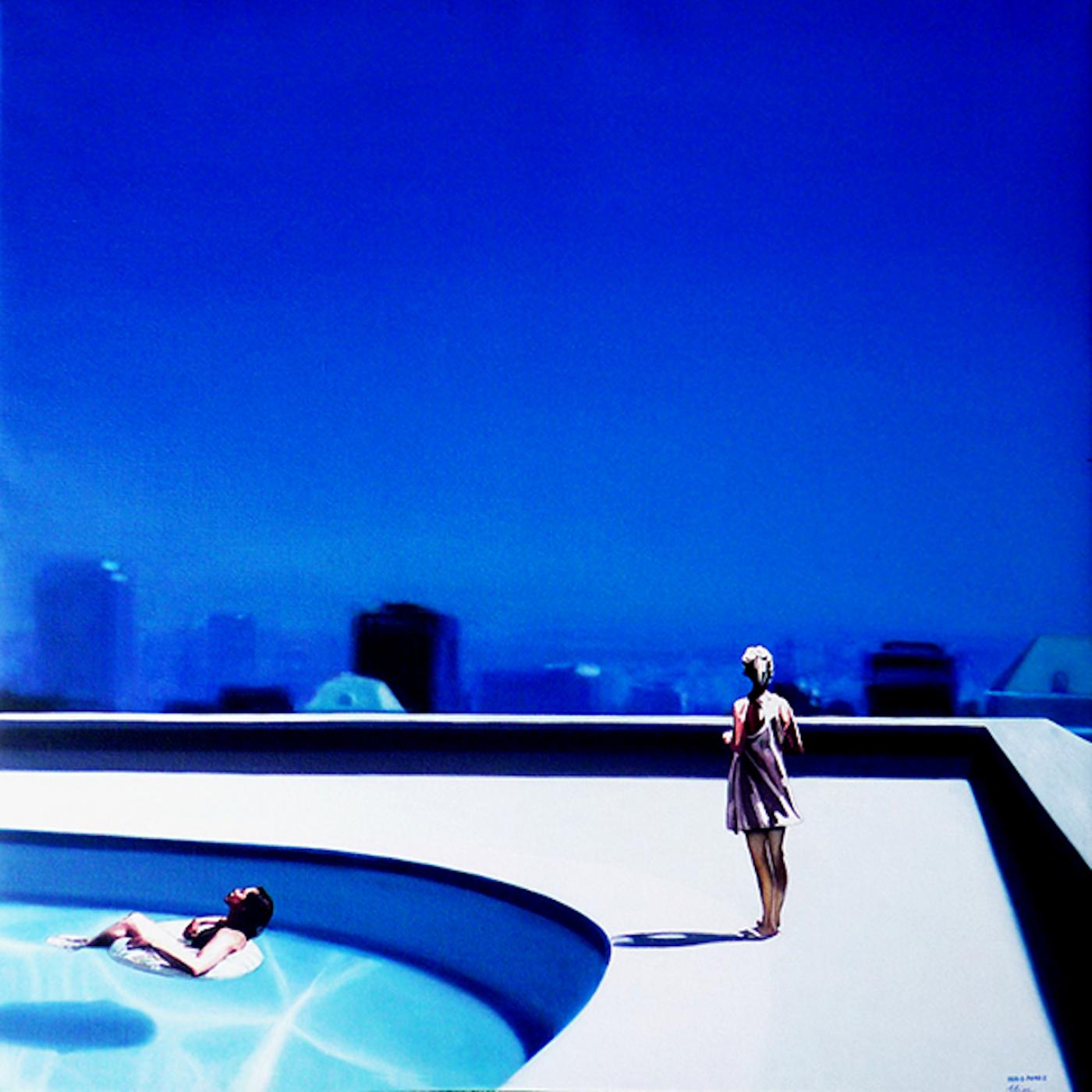 Hugo Pondz was born in 1975 in Namur, Belgium where he currently lives and works. In his dreams he travels to New York where he is interested in the urban landscapes and the empty, forgotten places. It is in the deep and dense blues, the luminous concrete and pools of calm and transparent waters that the artist, an observer, manages to capture the silence and impose a latent danger in a depiction which is almost minimalist in style, full of light and shadow. A subtle alchemy settles immediately between the observer and the piece where the ease of interpretation helps the observer feel part of a world, which is almost too idle. In it, children gaze towards the horizon, leading us into instrospection and bringing us beyong a wall that we must all overcome one day or another. -