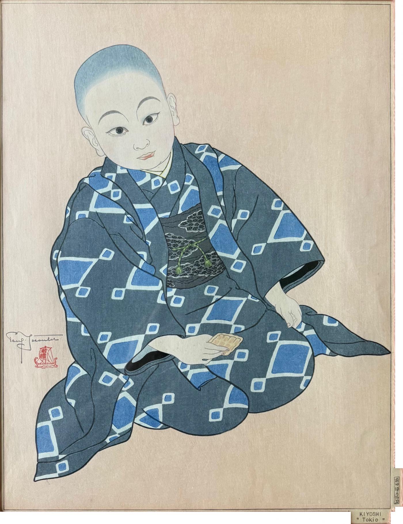A Japanese Woodblock print by Paul Jacoulet (French, 1896-1960) entitled Kiyoshi Tokio. Created in 1939, this print is rare with only one edition with fewer than 320 impressions executed. The floating seated figure of the young boy dressed in Kimono was one of the few such unconventional compositions in the artist's repertoire. The artist used seven shades of pink and pearl paper to achieve a youthful look of the boy.
