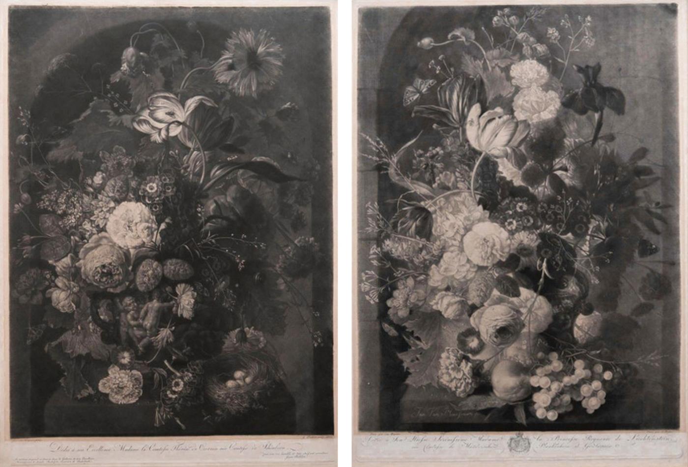 A handsome pair of mezzotints by Austrian printer Johann Peter Pichler circa 1806 after the original painting on copper by Jan van Huysum. They remain in a nearly pristine overall condition. The same prints are carried in the permanent collections of the Winterthur Museum, the British Museum of Art and the National Galleries of Scotland; the original painting for the print with the bird's nest is also held in the permanent collection of the National Galleries of Scotland. Pichler's representation of van Huysum's iconic work was cherished for the exquisite tones and richly textured surfaces. They were completed in Vienna, Austria circa 1806 while the van Huysum paintings were still part of the Czernin collection.