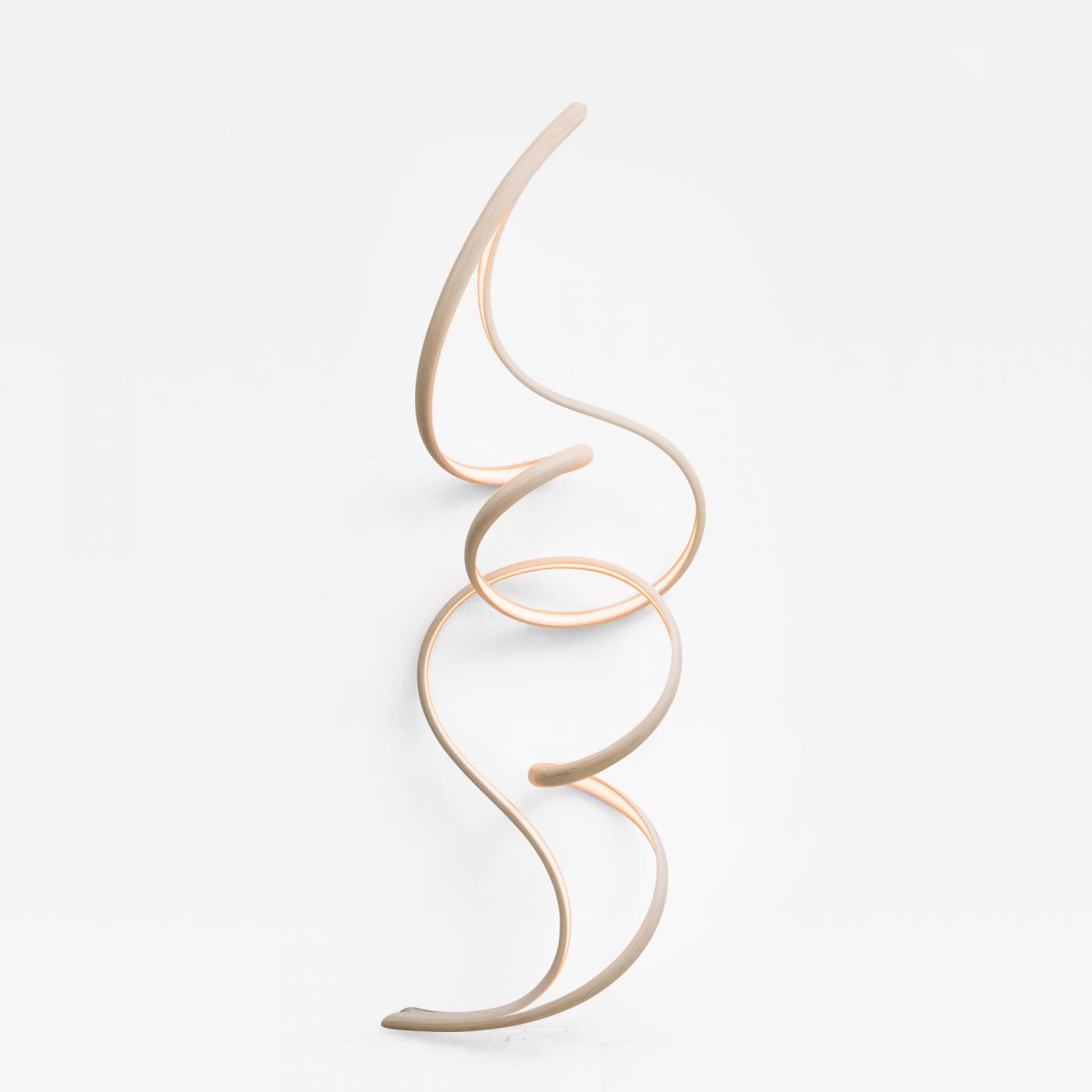 Procario’s sculptural lighting is composed of micro-laminated wood fused with LEDs. With a rough sketch in his mind, Procario freeform bends the wood into one of his signature undulating shapes. After months spent intentionally breaking wood—whether with a hydraulic press or simply his own strength—the designer gained a deep understanding of its structure and learned where to draw the line before hitting that breaking point. The process is a delicate one,“wood doesn’t always want to work with you when you are freeform bending so you have to work with it,” he says. “But I really enjoy that. Sometimes it takes you in new directions that would never have happened if everything was planned out. In this way, the artistic process becomes a collaboration between the artist and the wood’s respective personalities. The outcome is an organic, fluid design with a distinct sense of motion.