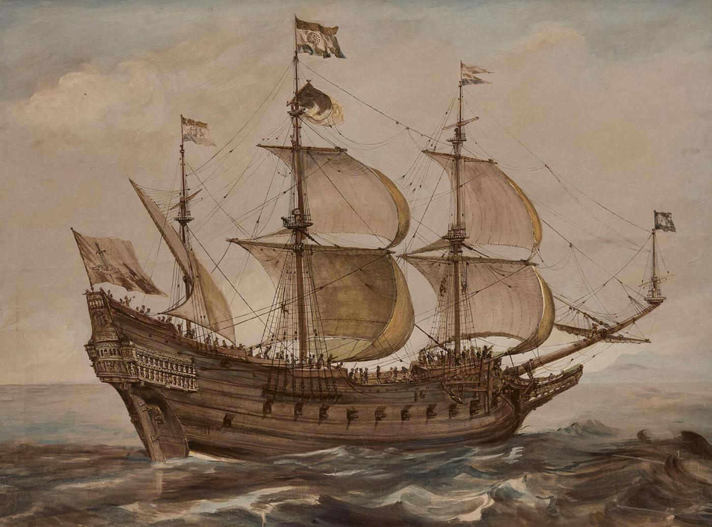 The painting captures both the engineering brilliance of the vessel and the romance of seafaring life. Its crew are visible upon deck, dwarfed by the towering masts and taut canvas above them—a reminder of the scale and power of these early naval giants. The restrained palette, punctuated by the Dutch tricolour fluttering at the stern, heightens the sense of authenticity and period atmosphere.
