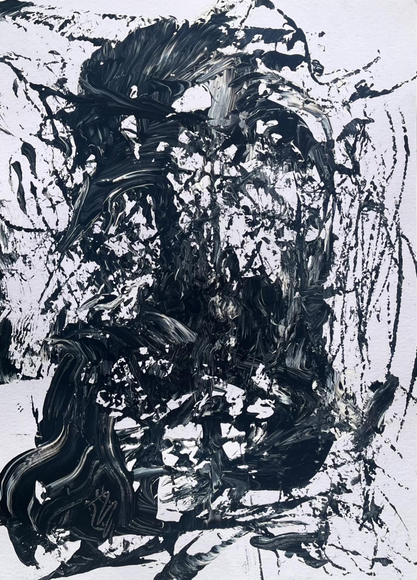 Fabia Kleinpeter, a German self-taught multidisciplinary artist born in 2000 who lives and works in Tbilisi, Georgia. She began her artistic journey in 2019 in the South of France under a star-filled night sky. It was a specific constellation of eight stars, uniquely shaped like a butterfly, that first sparked her creativity. From that moment, her pen became an unstoppable instrument, laying the groundwork for her eventual shift to canvas painting in Tbilisi, Georgia, where she has been based since 2020. In her works, she uses acrylic or oil paints with the aid of a spatula, creating vibrant, fluid abstractions that explore the interface between personal thought and collective memory. Her distinct approach to a black-and-white palette is designed to challenge perception, expanding the viewer's imagination by evoking three- dimensional depth. Her creative process was significantly refined following advice from fellow painter Luka Japaridze, who encouraged Fabia to translate her outstanding drawing style from paper to large canvases. The result was the monumental piece "Indikator" (2m x 1.8m), a significant milestone in her work. Beyond her paintings, DJIMBA uses video to complement her musical compositions, reflecting her passion for diverse modes of expression. Her art is driven by a central theme: the profound human need for connection, a thread that weaves through all of her creative endeavors. Her growing reputation is supported by several accomplishments, including an exhibition series named Mirrorhall and Mirrorhall II. in NewPlatform Georgia, such as a solo exhibition at the ArtMuse gallery in Tbilisi and the sale of a painting of the “Marao-Mosaik- series” to the artist community Nos-Revolution in Marseille, as well as the painting “In the bush jungle” to Café Nilo in Tbilisi. Recognition for her work extends to her hometown of Kraichtal near Karlsruhe, where she was featured on the cover of the “Kraichtalbote” newspaper and interviewed about her international career. Following that same interview, an additional article was published in the regional newspaper “Rhein-Neckar-Zeitung.” This was followed a year later by a second publication honoring her musical successes, vindicating her local relevance. These successes underscore the international appeal and recognition of her work. In her artworks, DJIMBA captures the fluid energy that lingers between visible colors—reminiscent of flowing lava within a volcano. Her canvases serve as portals into a cognitive sphere, inviting viewers to project their own consciousness and inhabit these abstract landscapes as an immersive, "offline" virtual world.