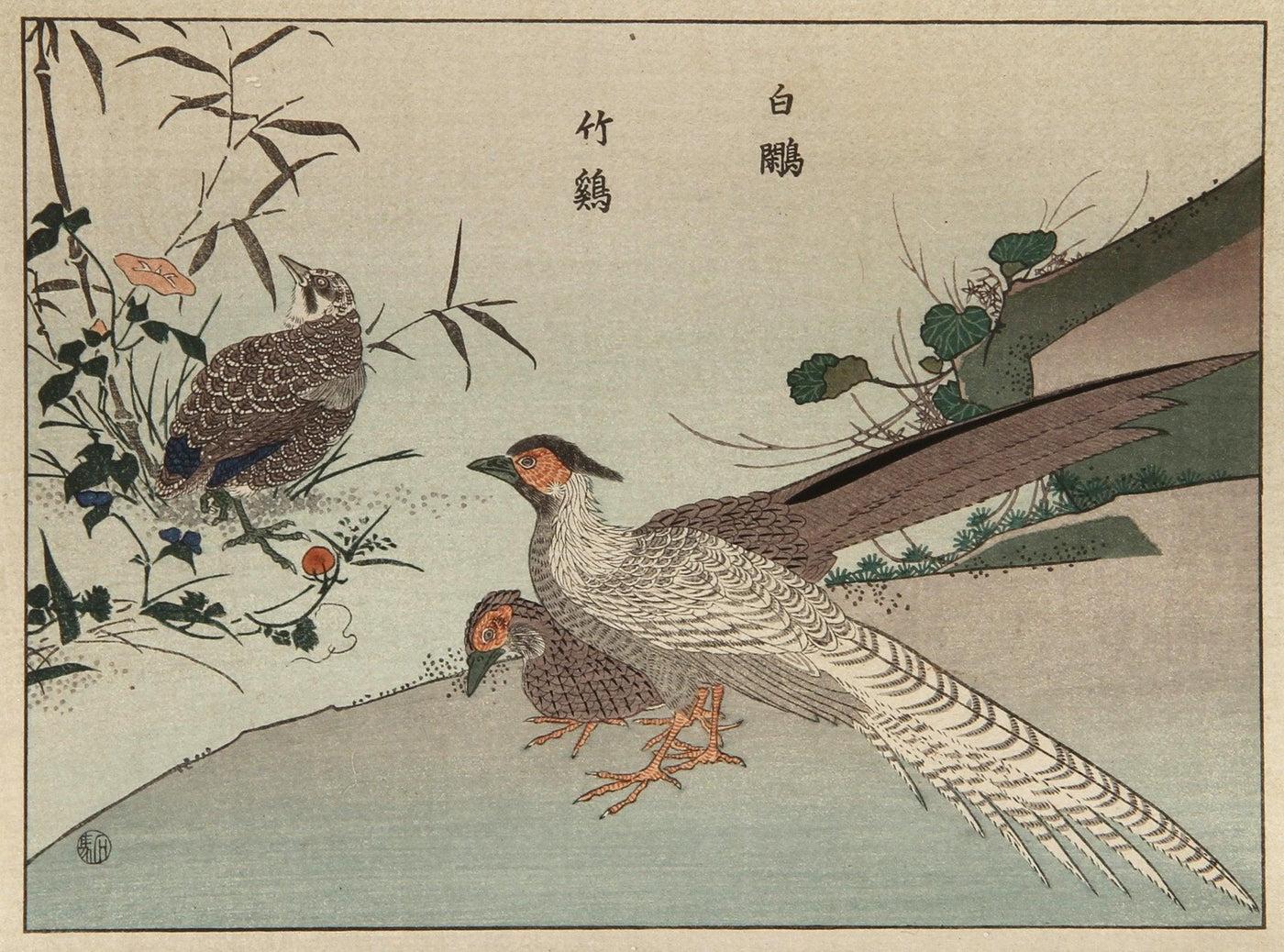 Rendered by an unknown artist, this example of ukiyo-e focuses on the natural beauty and elegance found in wild pheasants. -
