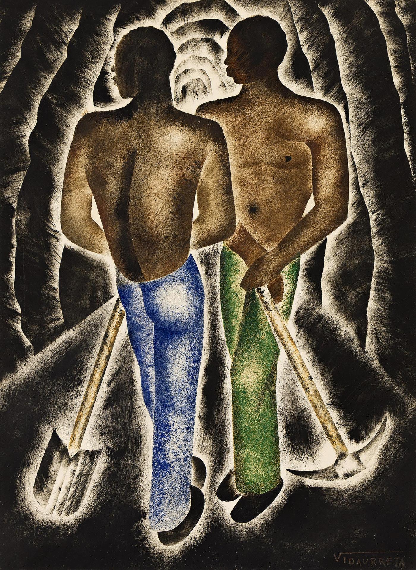Art Deco rendition of two Black Men with Muscular Bodies in an artistically formal pose with shovels and pitchforks. The work is executed in an Art Deco/Cubist style. Titled "The Miners"- Signed lower right. Titled in mat. Framed under glass 23 x 18, Gouache and Watercolor on Cream Wove Paper