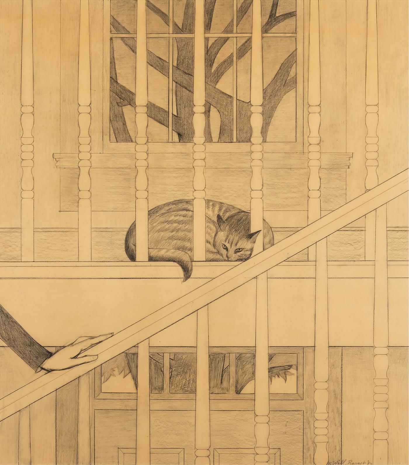 Cat Nap on the steps captured by realist painter Will Barnet. This is more than just a preliminary study; it's polished and precise, which allows it to stand on its own. In person, it is a compelling and beautiful unified work of art. In a sense, it's more agreeable to the eye than the final version, which seems a bit disconnected.