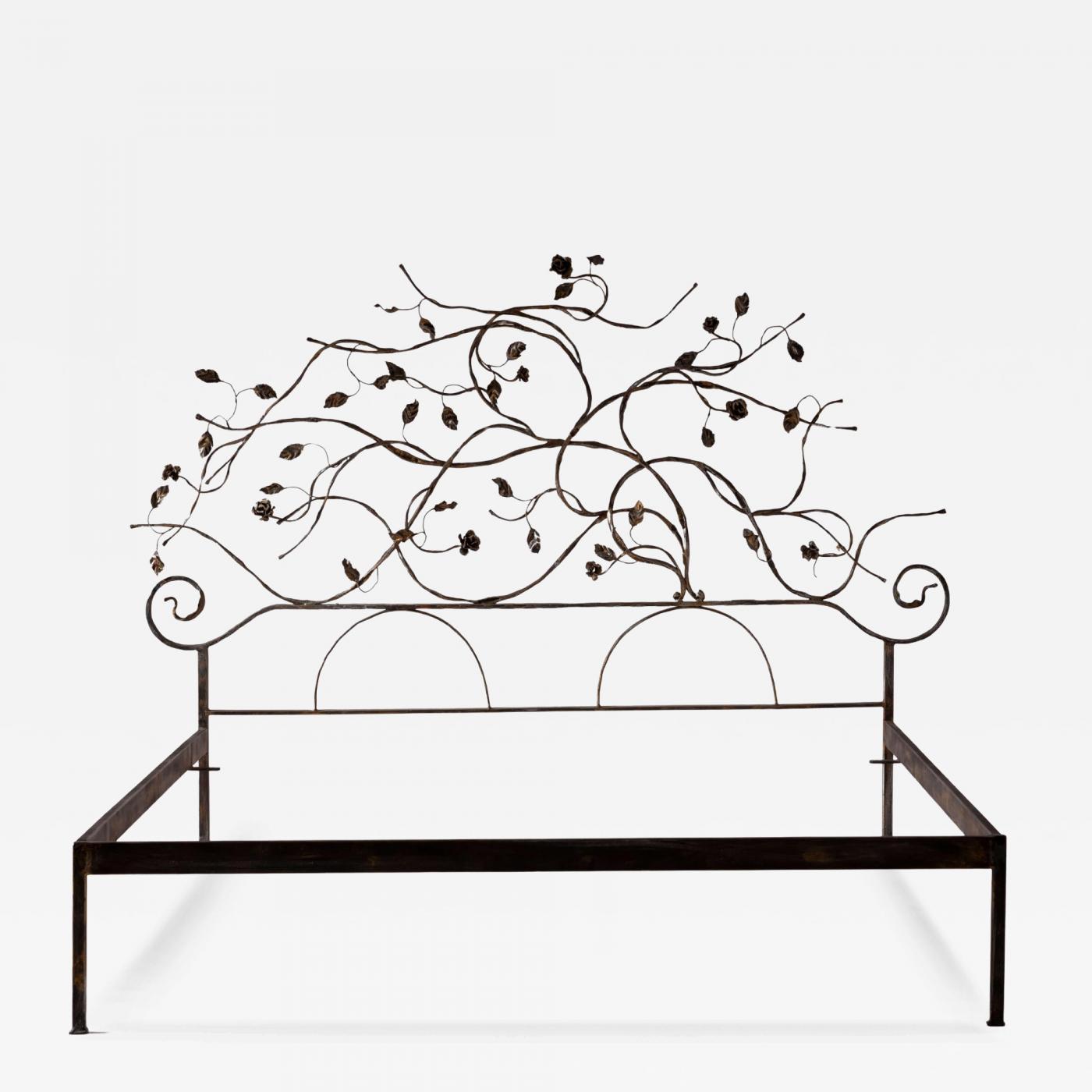 Elegance, strength, and lightness intertwine in the design of this wrought-iron double bed, created in the 1960s by sculptor and designer Salvino Marsura. The structure reveals a delicate balance between linearity and ornamental gesture: the rectilinear base remains sober and functional, while the headboard rises as a true sculptural relief, animated by twisting branches, leaves, and roses in wrought iron, unfolding in a fluid and organic composition.