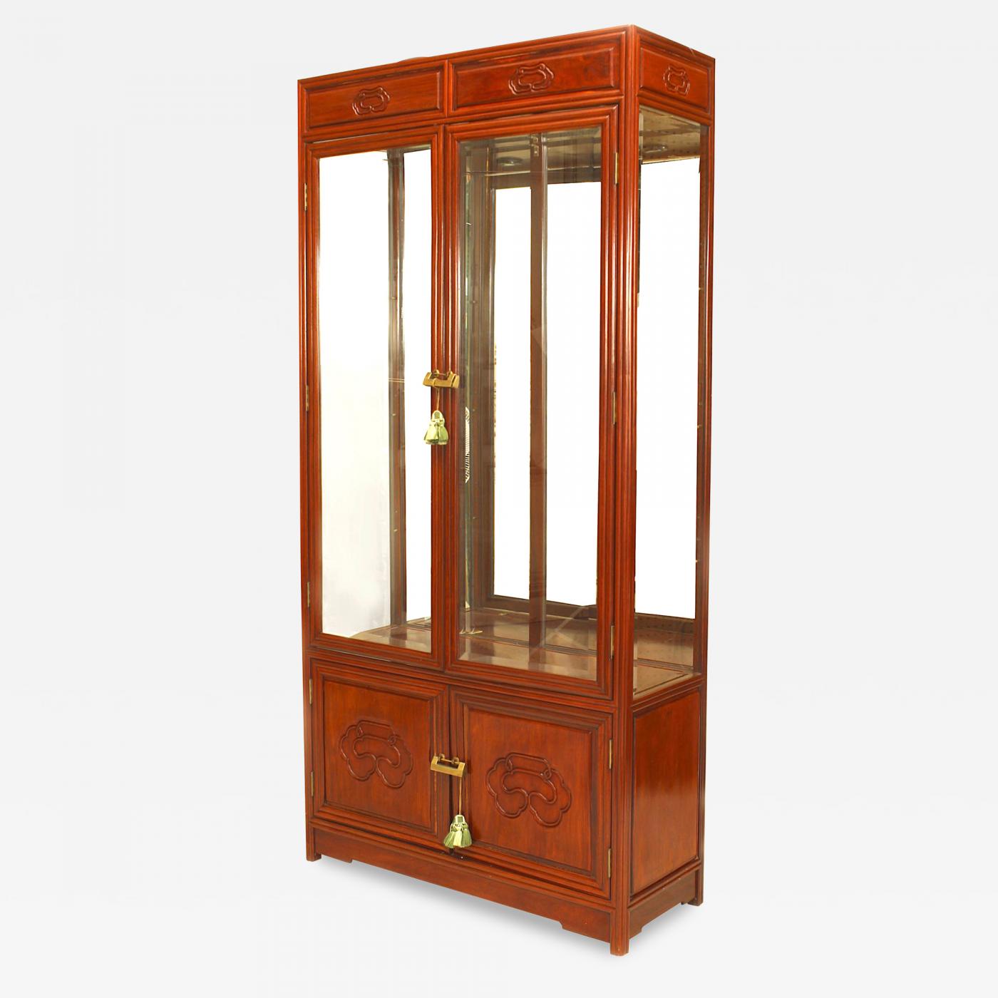 Asian Chinese (20th Century) hardwood display vitrine cabinet with 2 large glass doors with carving on 2 bottom doors and 3 shelves with glass in wood frames.