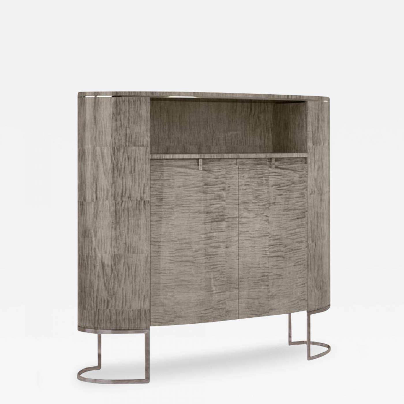 The Diamond storage unit consists of an upper open compartment and two doors with glass shelves. The metal profiles and base give the whole element a touch of light that reflects on the precious oval-shaped essence.