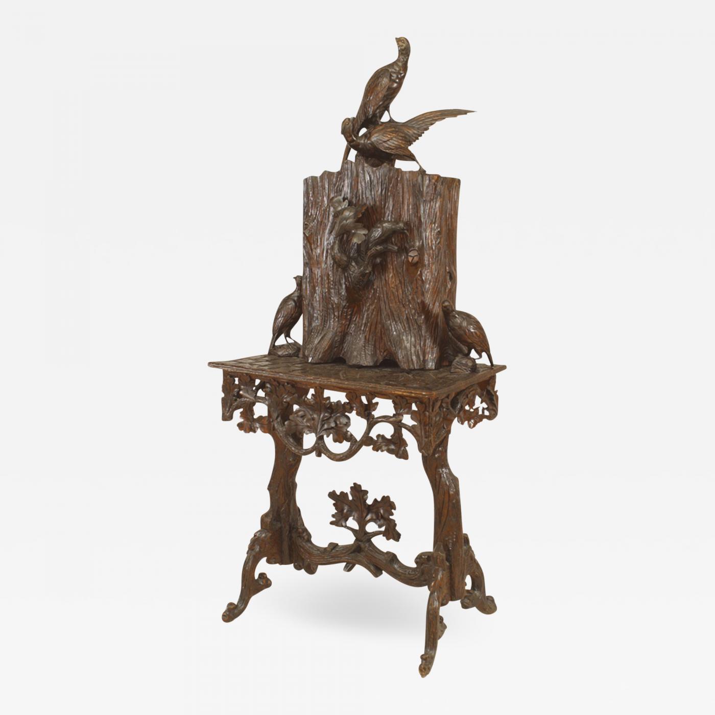 Rustic Black Forest (19th Cent) carved walnut cabinet on stand with birds and floral filigree apron