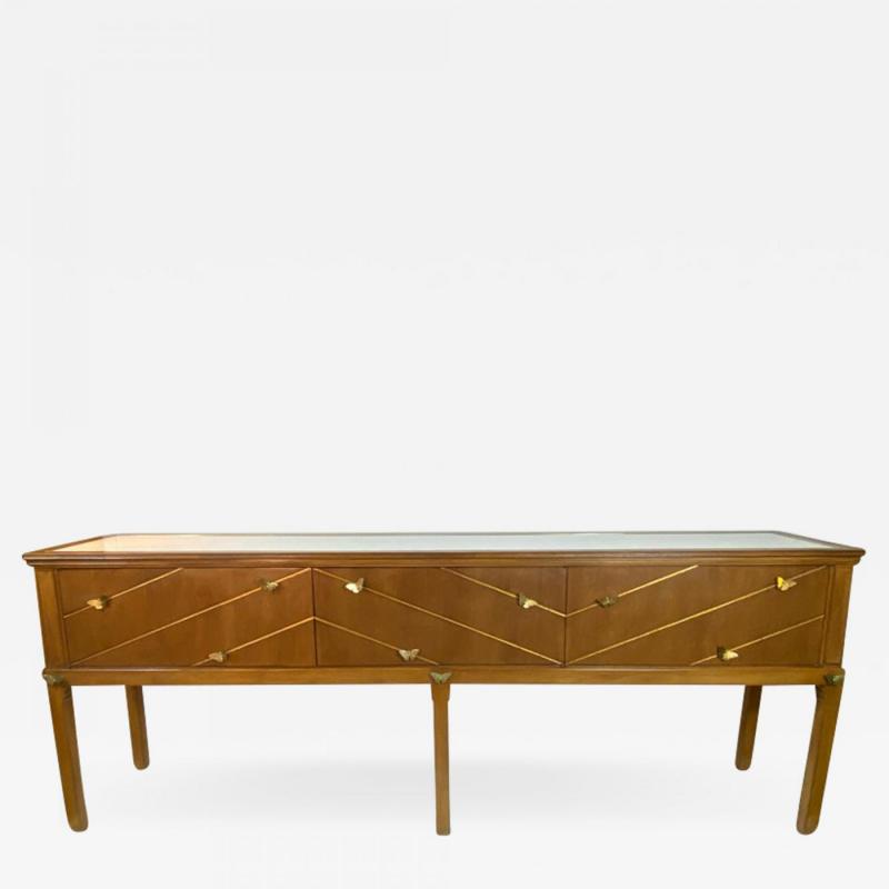Beautiful And Unusual Blond Wood Sideboard Adorned with12 Gilt Brass Butterflies. There Is a Inset Rectangular White Vitrolite Glass Top Framed with Brass. There are Incised Stripe Designs on Each Door That are Gold Leaf Met With A Brass Butterfly. Three Doors Open To Reveal Six Drawers, Two Deep Brown Fabric Lined. Designed in The 1950's By Tommi Parzinger For A Custom Design Commission.