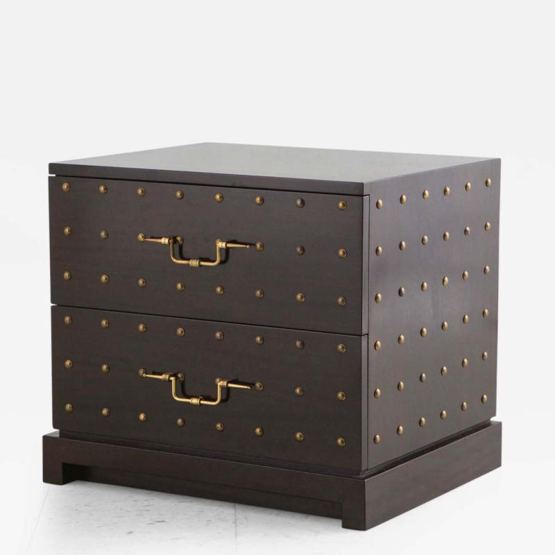 A two-drawer walnut dresser set with bronze studs and all original solid brass hardware. This is a stunning example of Tommi Parzinger for Parzinger Originals; in excellent restored condition, it is the perfect size for a bed-side dresser.