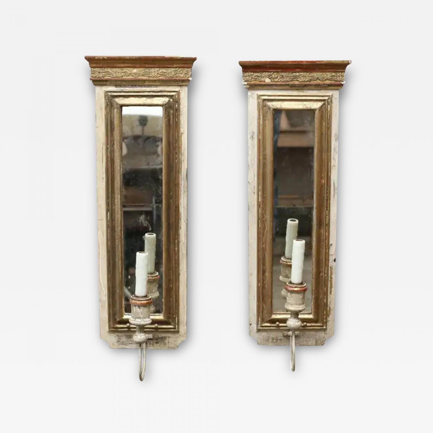 Sconces made from 18th century gilt fragments and antique mercury mirror. Sconces have been wired for use in the United States. Wax candle sleeves.