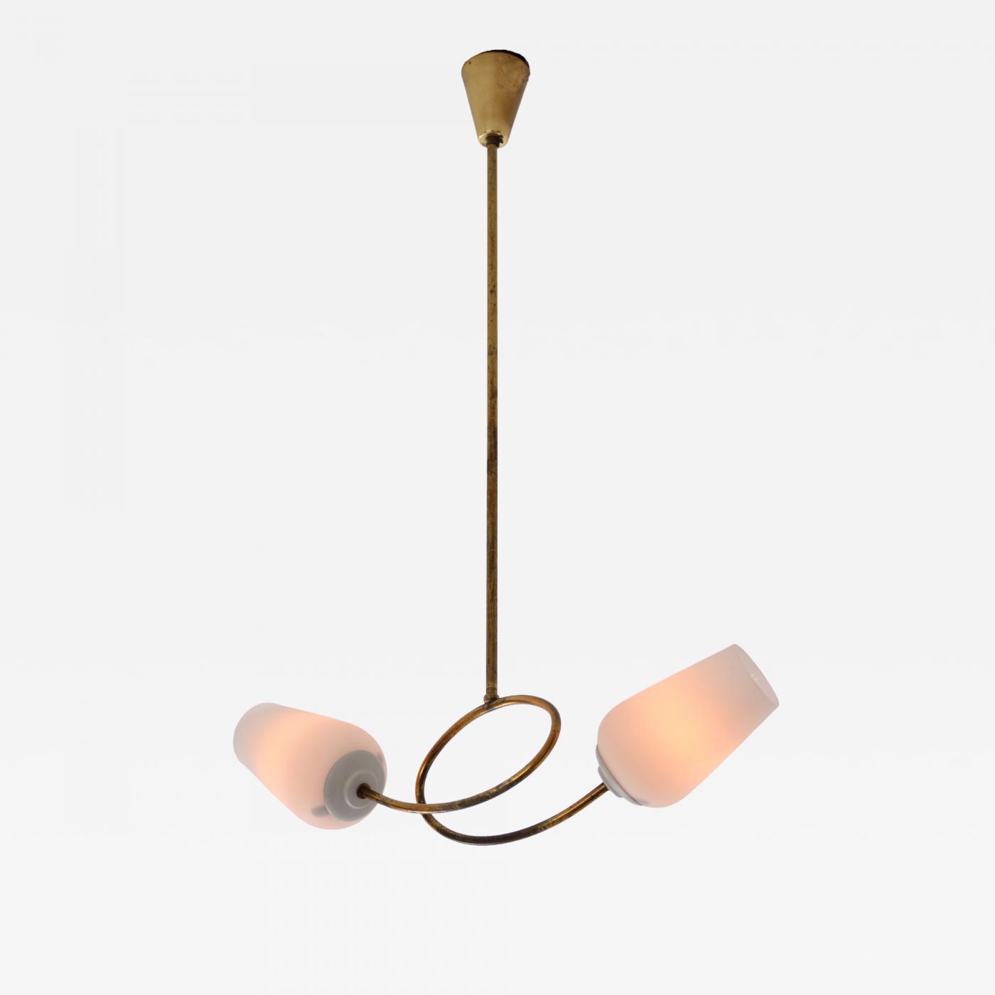 Two-light chandelier from the 1950s featuring a brass stem and a circular central ring supporting a pair of opposing arms. Each arm holds an angled opaline glass diffuser with a soft, tapered profile. Original brass shows a uniform patina from age; glass shades are clean and intact.