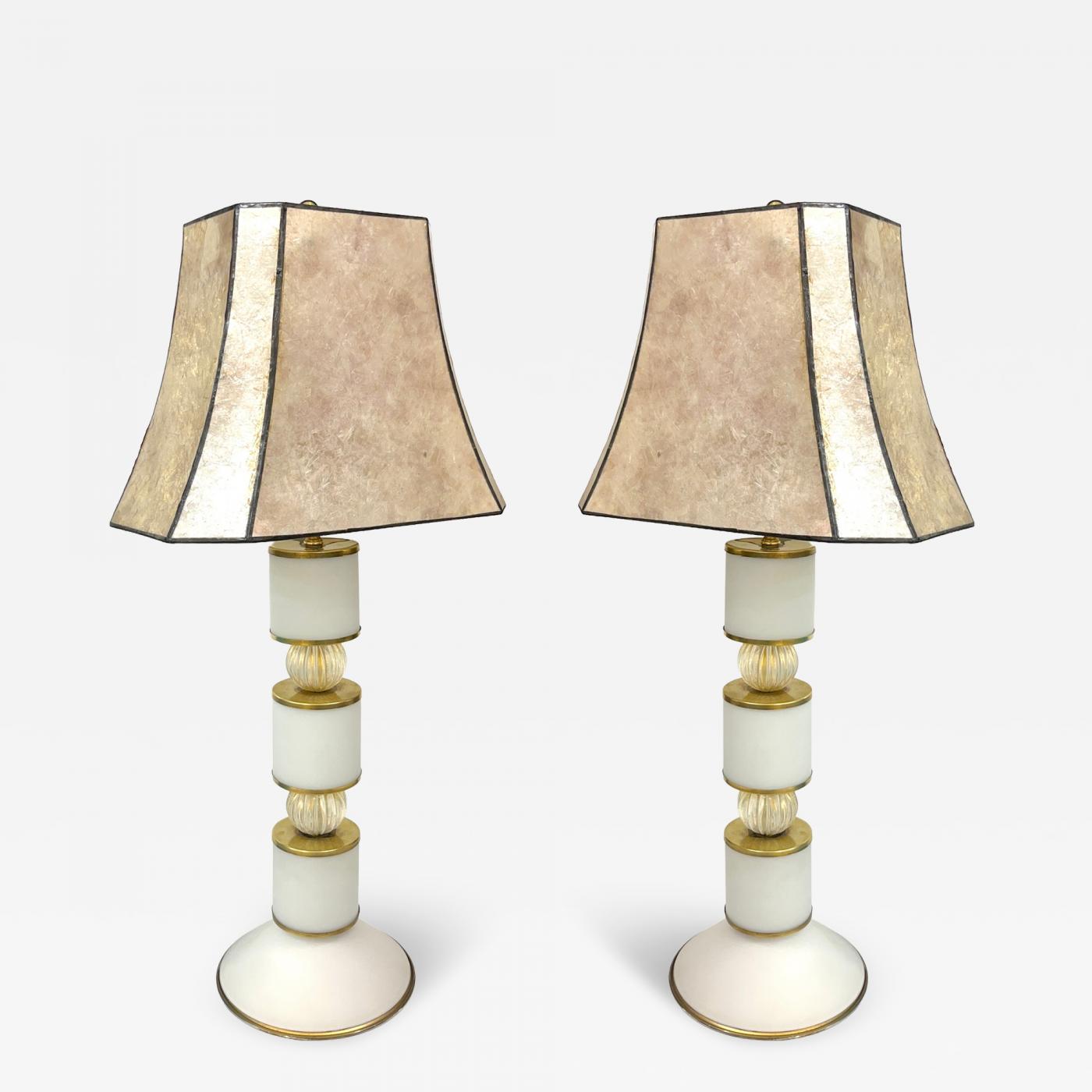A rare elegant pair of tall Italian Murano glass lamps, a one-of-a-kind vintage treasure attributed to Cenedese & Albarelli, circa 1950s, featuring authentic Murano glass craftsmanship. Entirely handcrafted in Italy, these exceptional statement pieces feature 3 opaline matte white Murano glass cylinders, each framed with quality brass edging, beautifully contrasted by two fluted mouth-blown glass spheres infused with pure gold. The lamps rest on a refined conical glass base with brass detailing, enhancing their sculptural silhouette. Each lamp is fitted with a handcrafted mica tapered art shade, allowing for a soft, warm translucence that creates an inviting and organic ambient glow. Why we love them: for their tall architectural form with sculptural details, for their harmonious blend of modernist lines and artisanal luxury, this pair, in very good vintage condition, exemplifies the best of mid-century Italian design, where art, craft, and light merge into a singular, elegant statement. Ideal for living rooms, entryways, or luxury bedrooms. Dimensions: Height without shades 22.5 in. Base diameter 9 in. Height of shade 11.75"