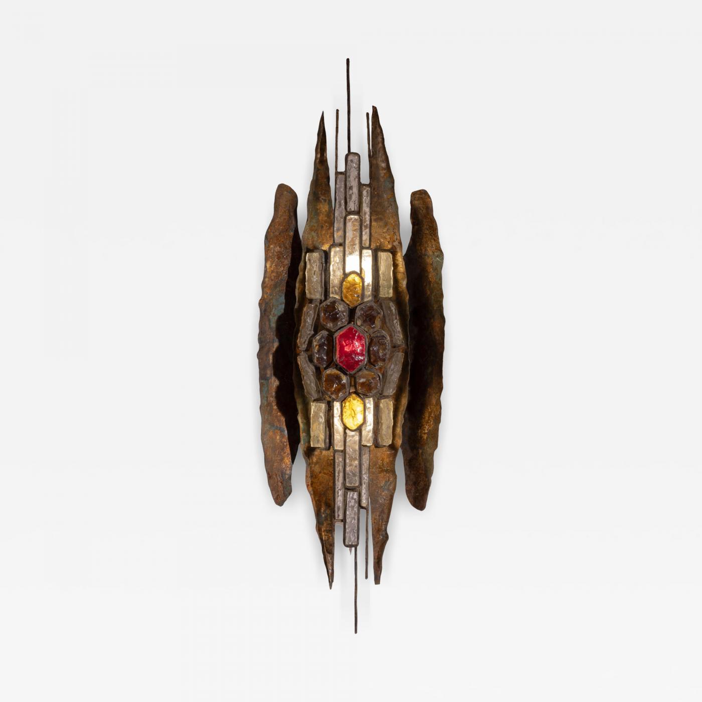 The structure is executed in hammered metal, gilded and heavily patinated, with an intentionally rough and uneven surface that foregrounds the process of making. Embedded within the metal body are chiselled and ground coloured crystal elements, arranged in a dense, axial configuration. The glass varies in tone—clear, amber, and deep red—and is left visibly textured, allowing light to pass through in a fractured and irregular manner. The contrast between the raw, oxidised metal and the luminous, faceted crystal is central to the object’s visual impact.