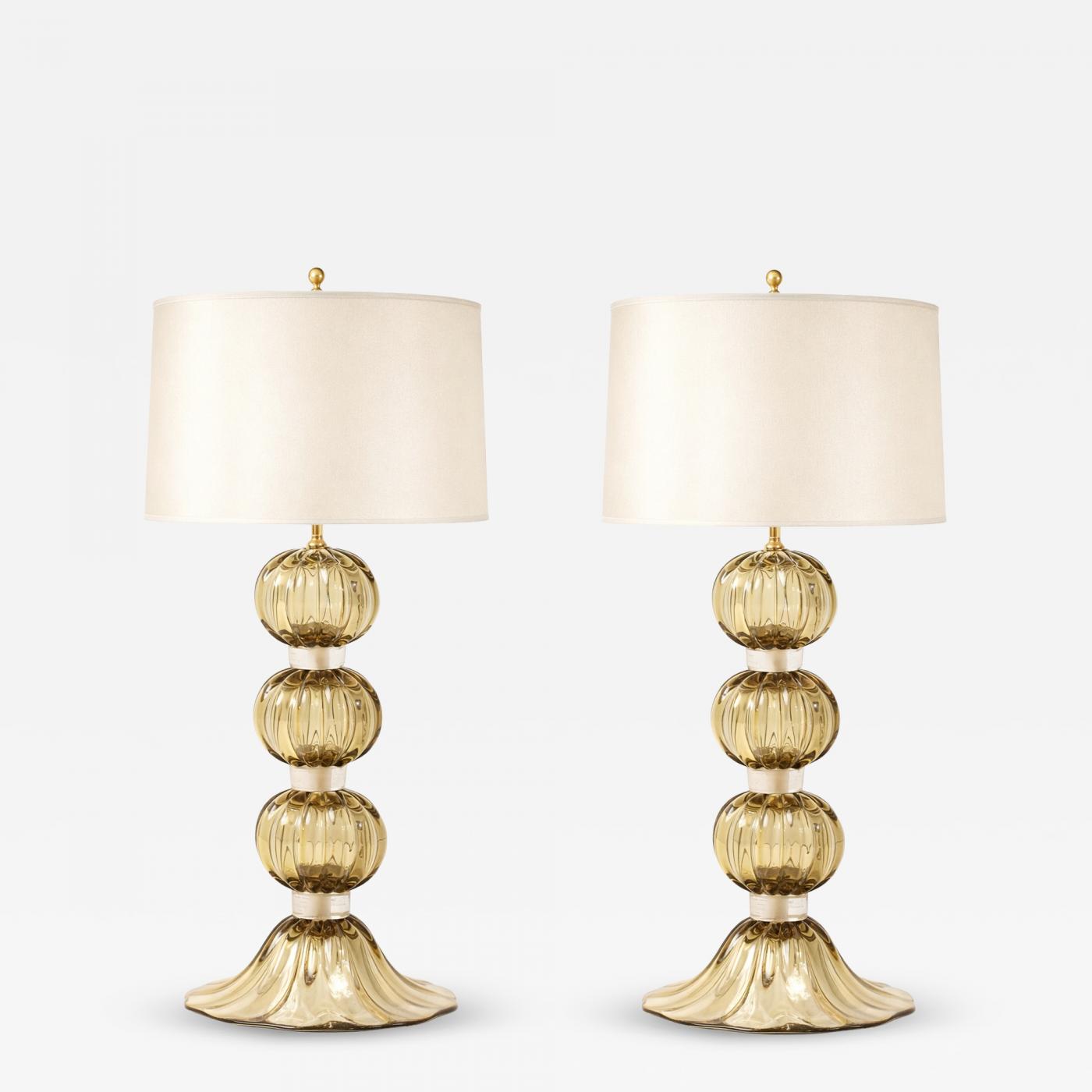 Pair of Golden Amber or Champagne "Pagliesco" Murano Glass Lamps handblown in Venice, Italy, by the master glassblower Alberto Dona. Textured (ridged) glass spheres are separated by glass rings that are fused. The Murano glass is a rich hand-blown smoked amber glass, distinguished by its warm, honeyed glow and subtle smoky undertones and rich shimmering effect. This pair of lamps has been wired for the US market and is on display at the 1stdibs Gallery at the New York Design Center. Lampshades are not included and only for reference purposes. Measurements are as follows: Overall diameter: 9.5" (at the base), Height of glass base: 16", Height to the edge of the socket: 19" (not including the harp)