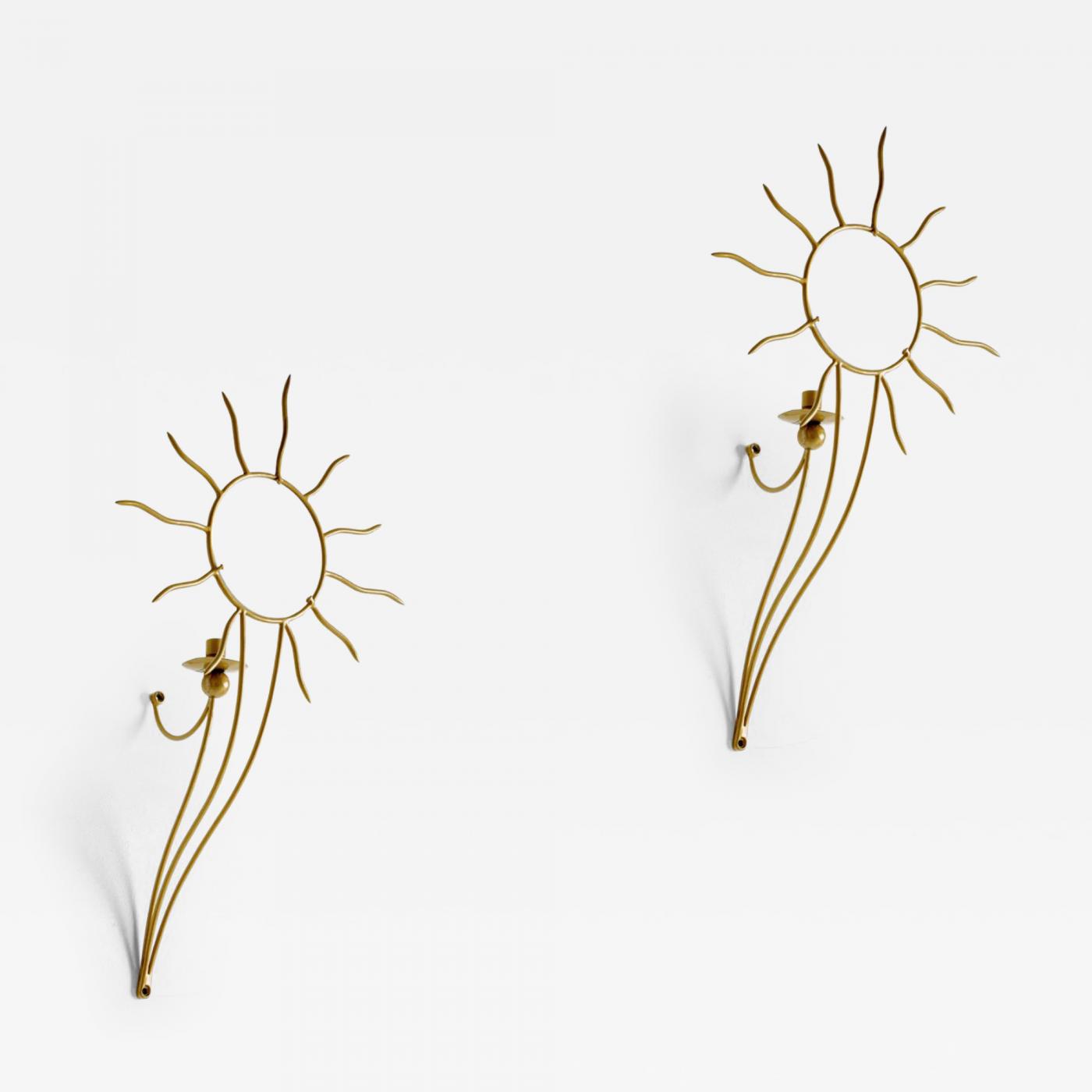 A pair of Soleil wall appliqués with space for one candle and a convex glass panel with a sun motif. The glass panel magnifies the candle behind it, enhancing the light effects. The elegant frame is gold-colored and is fixed to the wall at two points. This is an authorized reproduction of the original 20th century design.