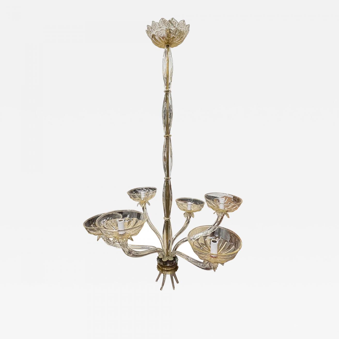 Offered is a most unusual Murano chandelier by Archimede Seguso from late 1930 to early 1940. This beautiful hand blown Murano glass chandelier is a clear glass infused with gold. This chandelier has a beautifully sculpted column with six arms with lovely coupes at alternating heights terminating in an unusual design. This type design is no longer in production as it is most difficult and time consuming.