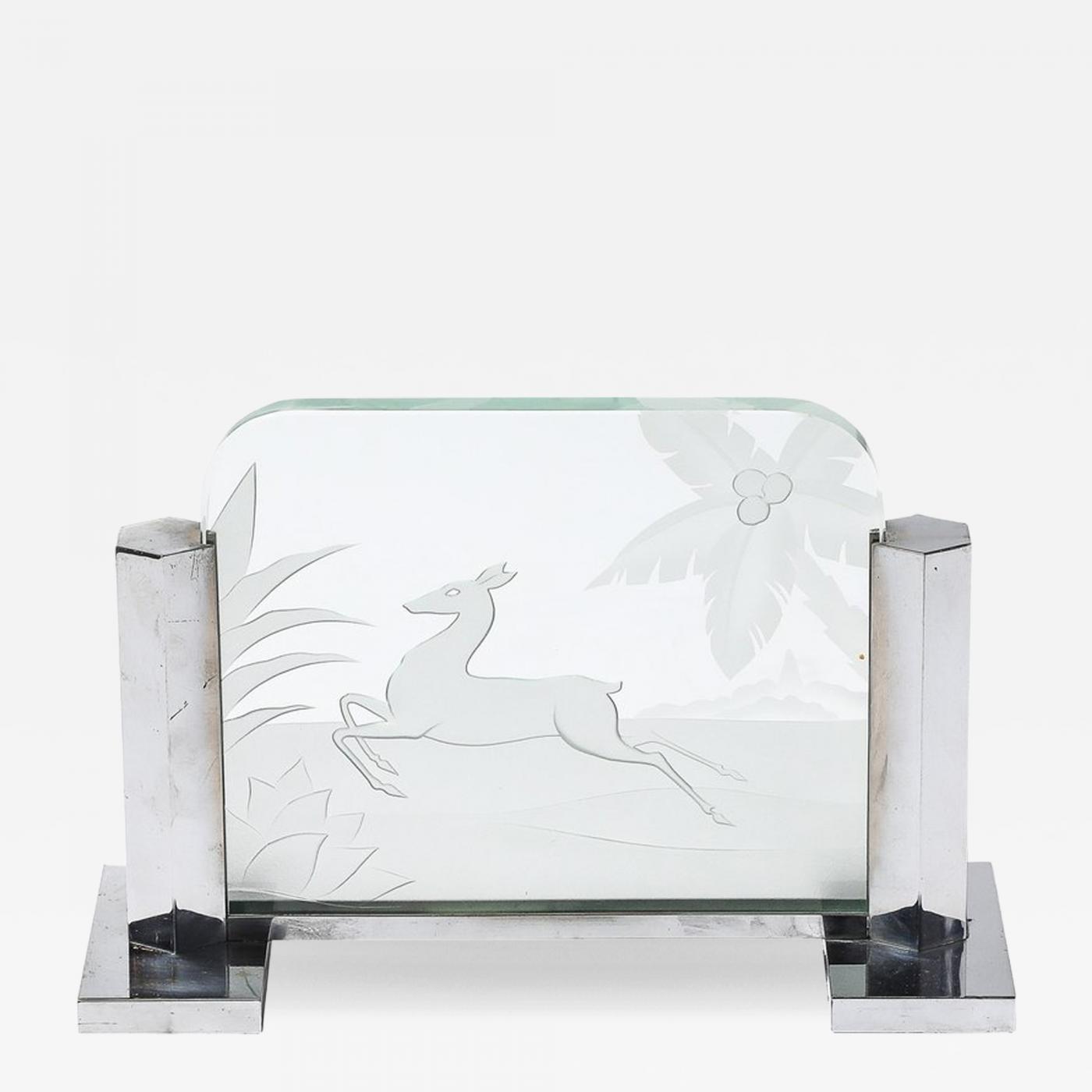 This elegant Art Deco table lamp, crafted in France circa 1930, is a striking example of early 20th-century design, blending intricate craftsmanship with bold artistic motifs. Made of silvered bronze, the lamp is notable for its exquisite detailing, including a reversed etched glass panel depicting a leaping gazelle motif. The gazelle, a symbol of grace and speed, reflects the themes of nature and dynamism that were central to Art Deco design. This table lamp is as functional as it is artistic. It provides soft, ambient lighting, perfect for creating a warm and atmospheric glow in living rooms, bedrooms, or workspaces, while serving as a sculptural piece that tells a visual story. The combination of the dynamic gazelle image, silvered bronze finish, and clean lines makes the lamp a versatile statement piece that complements Art Deco interiors or blends seamlessly into transitional or contemporary settings. This Art Deco silvered bronze table lamp is a superb example of both technical innovation and artistic design from the 1930s. Styling beautifully in a wide array of spaces and settings, from Chic Art Deco to Mid-Century Modernist and Contemporary Interiors. Newly rewired to American Standards, this lamp accommodates two mini-bayonette base bulbs achieving up to 120 watts of light. In Good Vintage Condition.