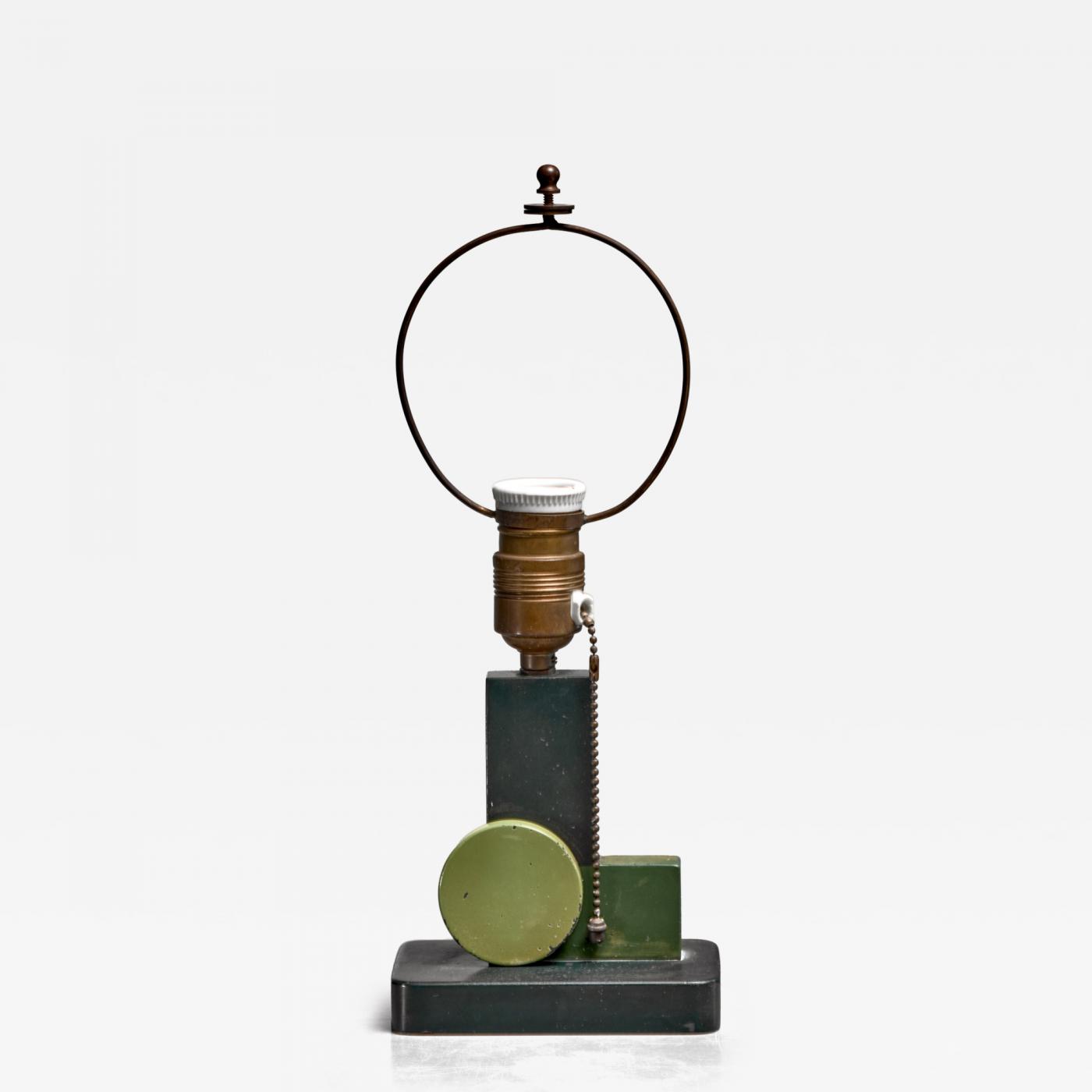 An Art Deco table lamp featuring a black marble base with a green lacquered sculptural cast iron stem.