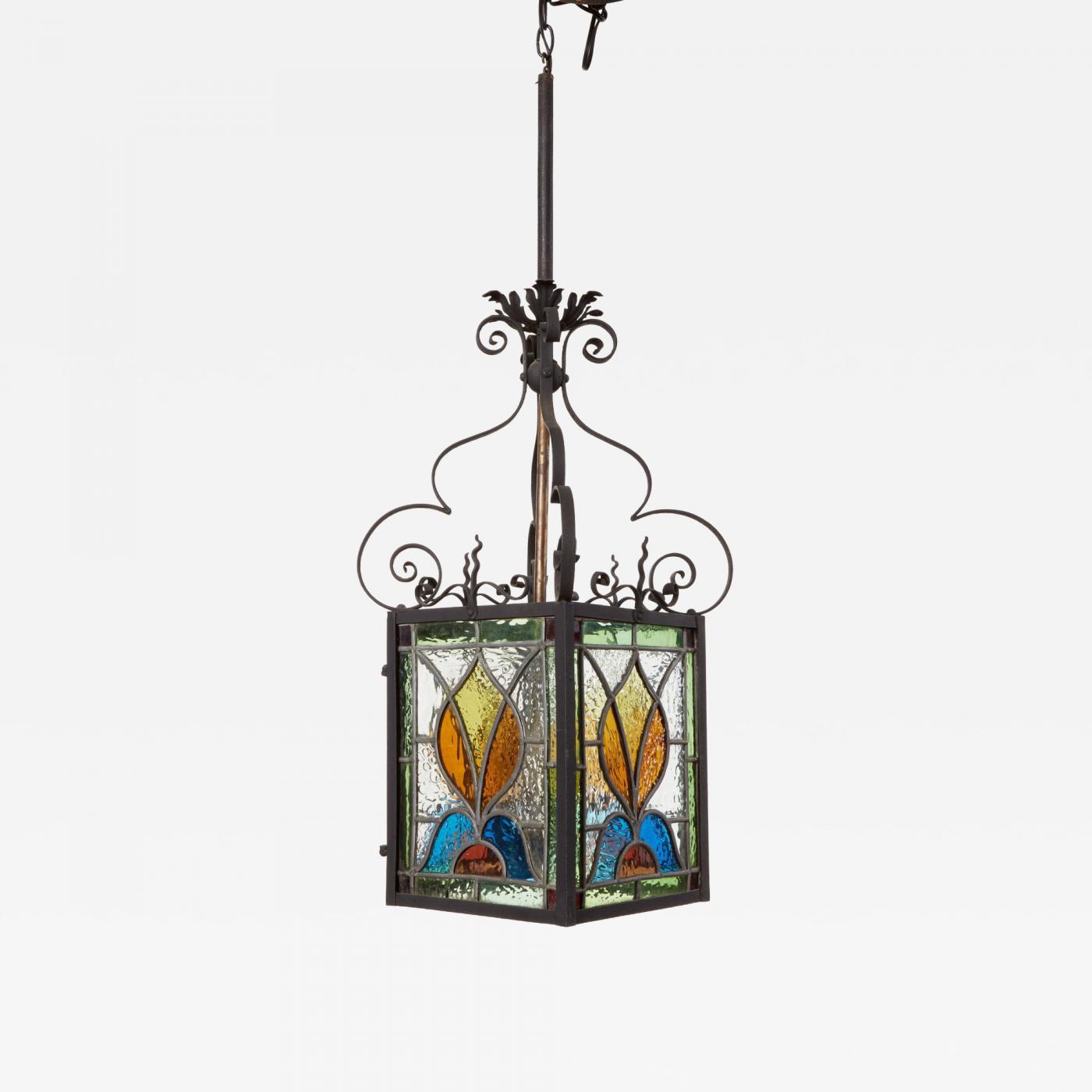 A vintage wrought iron and glass hanging lantern with a rectangular box iron frame topped by bold ornate iron scrolls and a decorative iron flourish transition into the hanging rod. Colored jewel-tone stained glass panels set in leaded glass lites in a tulip pattern on each of the four sides with shades of emerald green, amber, cobalt blue, and clear rippled glass creating a luminous effect when lit. One side an operable door. The overall aesthetic blends Arts & Crafts and Spanish Revival influences, making it a striking accent for an entryway, stair hall, or covered porch. England, circa 1900.