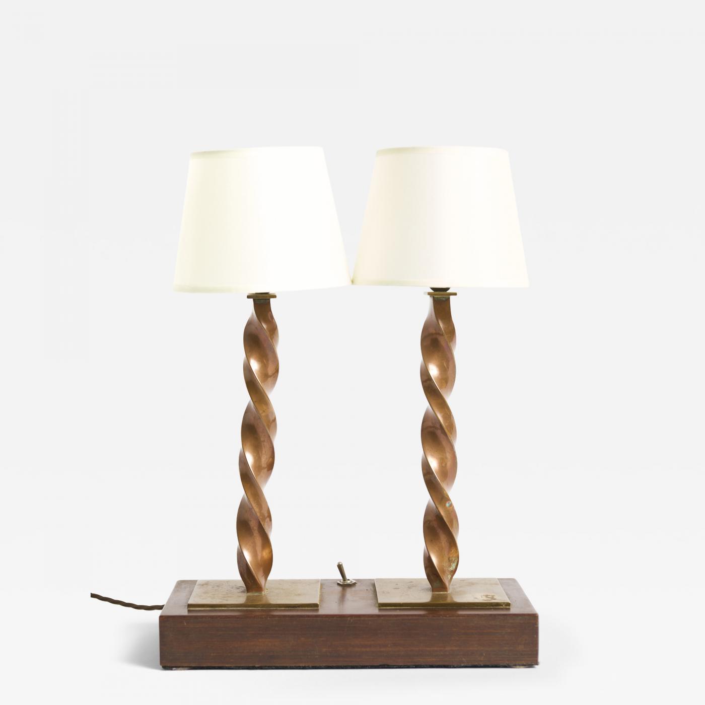 An Arts & Crafts table lamp, with two twisted copper stems, resting on a lignum vitae base.