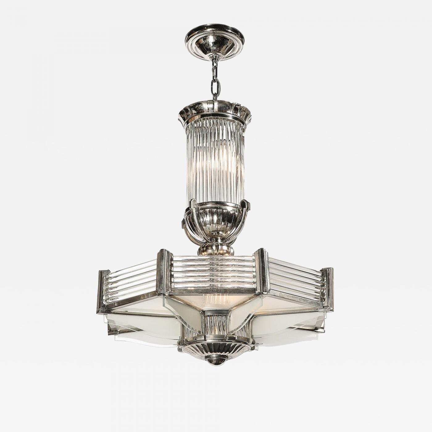 This stunning Art Deco chandelier was realized by the legendary Atelier Petitot in France circa 1930. It features a prominent round channeled finial in satin nickel with a convex protuberant center detail topped with vertical translucent glass rods. Eight frosted glass panels sit along the bottom of the chandelier secured by streamlined glass supports suggesting stylized fins. These sculptural glass embellishments meet vertical rectangular supports along the sides of the chandelier that run vertically holding the myriad stacked glass rods in place. The rod of this fixture consists of a bullet form embellishment with an abundance of glass rods also secured by polished nickel fittings. With its iconically Art Deco sensibility (and materials) by one of the great makers of the 1930s, this piece is sure to delight discerning collectors of the period as well as those with a penchant for all things exquisite. The height can be adjusted to suit. The chandelier has been newly rewired to American standards and is in excellent vintage condition. The chandelier accommodates eight European based bulbs, providing more than ample illumination for virtually any interior setting.