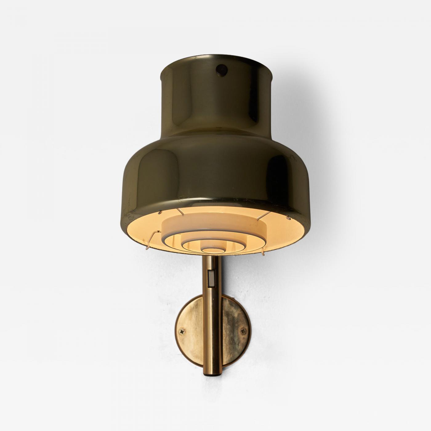 The "Bumling" wall sconce was designed by Anders Pehrson for Atelje Lyktan in 1970. This model features a brass shade with a signature circular profile, mounted on a flexible rod that allows for adjustable light direction. As a classic of Swedish mid-century design, the Bumling series is celebrated for its functional simplicity and high-quality metalwork.