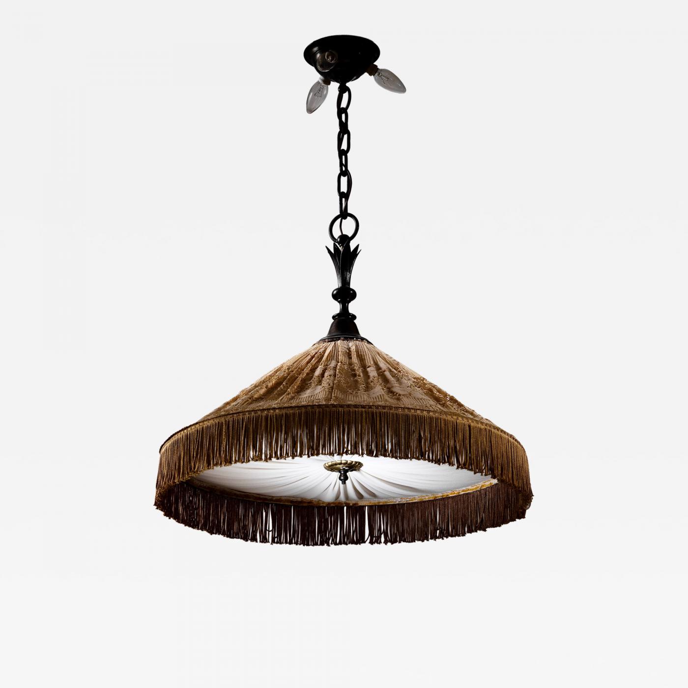 An Art Nouveau pendant lamp by Harald Notini for Böhlmarks, fitted with a large conical fabric shade decorated with lace and fringes. It features a pleated silk diffuser and is suspended from a darkened metal canopy with integrated lights.