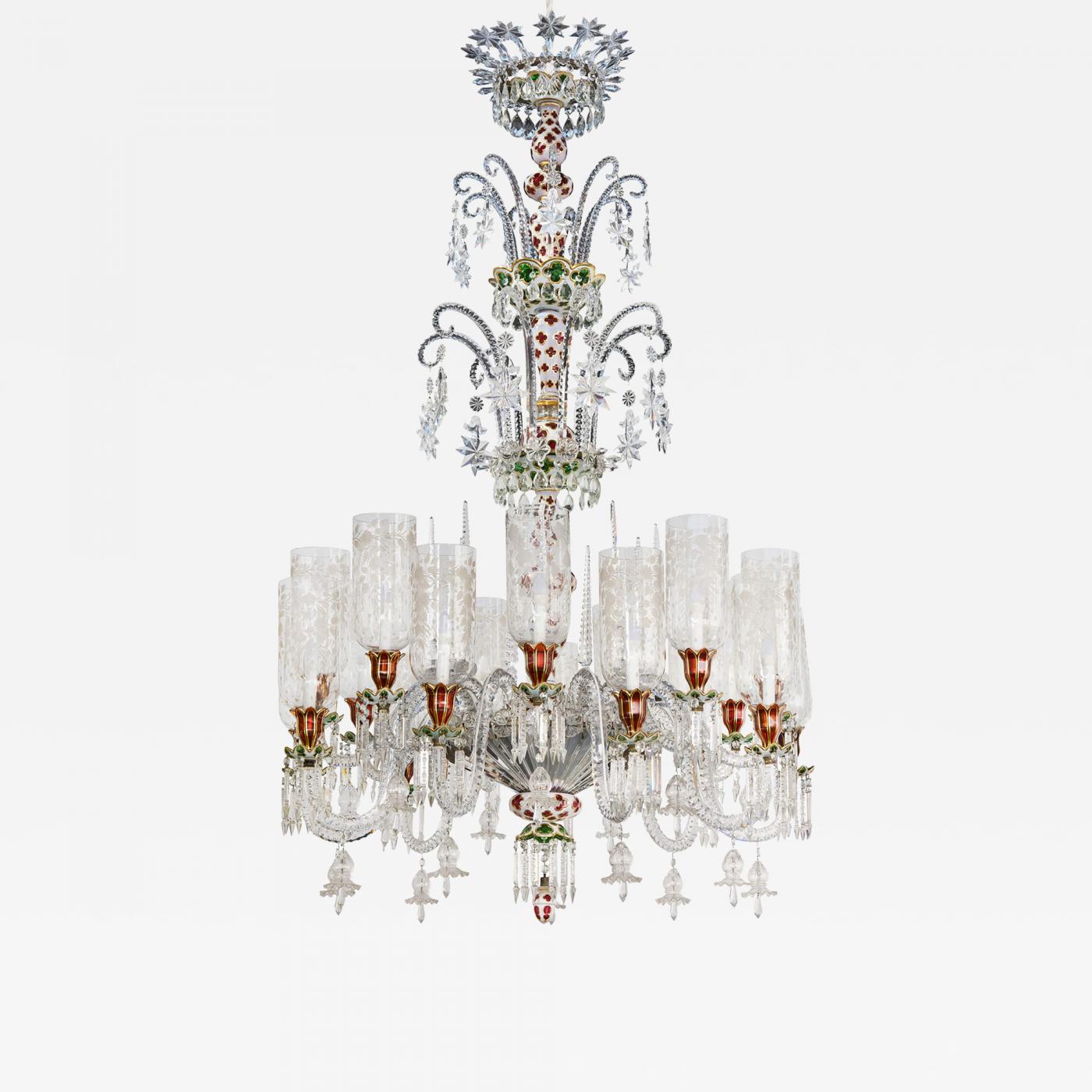 The twelve-branch frame, richly adorned with cut and coloured glass, supports tall etched shades that diffuse the light with delicate brilliance. Rising above, the stem is decorated with enamelled and gilded floral motifs in red and green, culminating in a crown of radiating sprays. Both sculptural and decorative, the chandelier speaks to the 19th-century desire to transform functional lighting into an object of splendour.