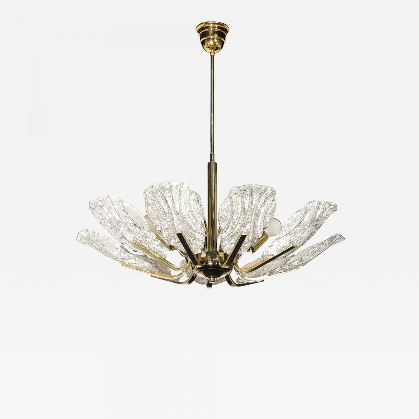 Suspended by elegantly proportioned polished brass fittings, the chandelier’s design achieves an impeccable balance of functional simplicity and decorative sophistication. The combination of the sleek fittings and the intricate glasswork captures the essence of Italian modernist design and fits seamlessly into a variety of interiors, from transitional to modern. Perfect for illuminating dining spaces, entryways, or living areas, this Barovier & Toso chandelier elevates any room with its understated glamour and artistry. A testament to Murano craftsmanship and the enduring legacy of mid-century design, this piece is a collectible treasure for lovers of Italian glass and modernist decor. Newly rewired to American Standards and with height that can be adjusted to suit, this chandelier accommodates 9 edison base bulbs achieving up to 900 watts of light. In Excellent Vintage Condition.