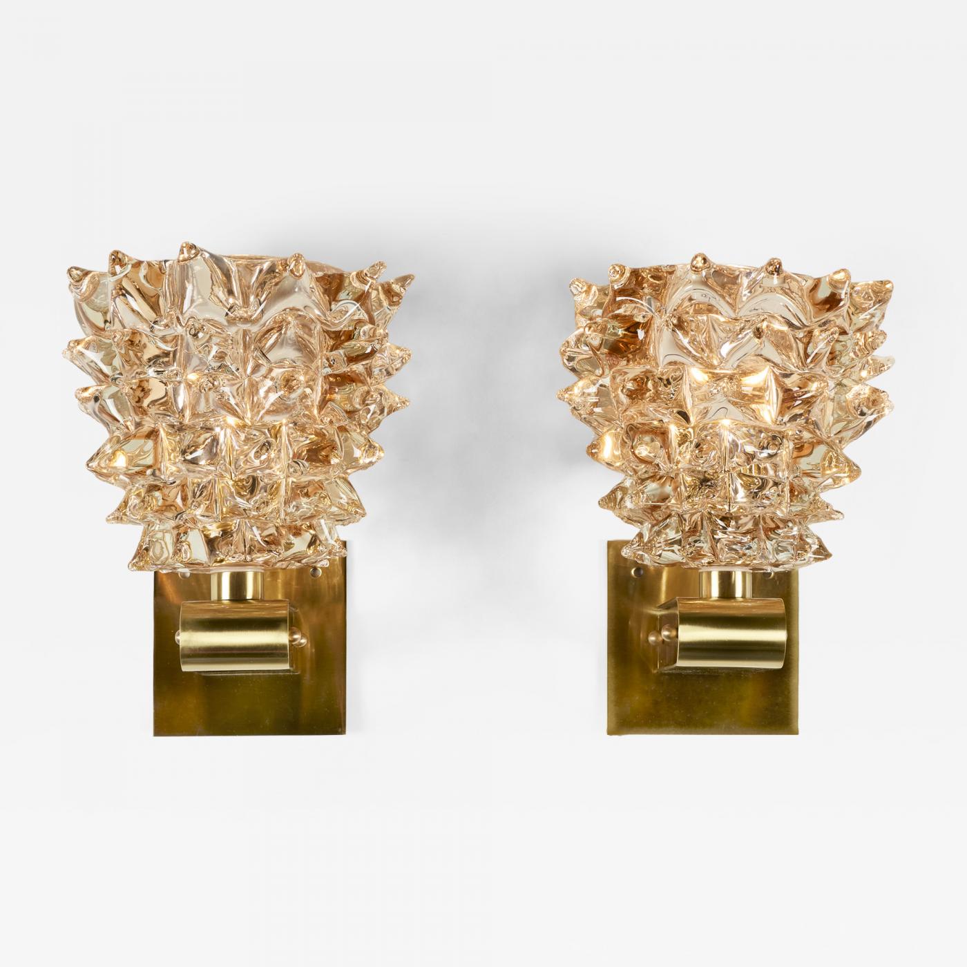 Chic Italian brass and pink rostrato murano glass wall lights. Hand-crafted heavy wall lamps made of pink Murano glass using the rostrato technique made famous by Barovier & Toso, meaning that each segment of glass has been individually fired in relief to achieve a dramatic three-dimensional effect. Each glass is mounted on an elegant curved brass stand with square backplate. Exudes a lovely warm light. -