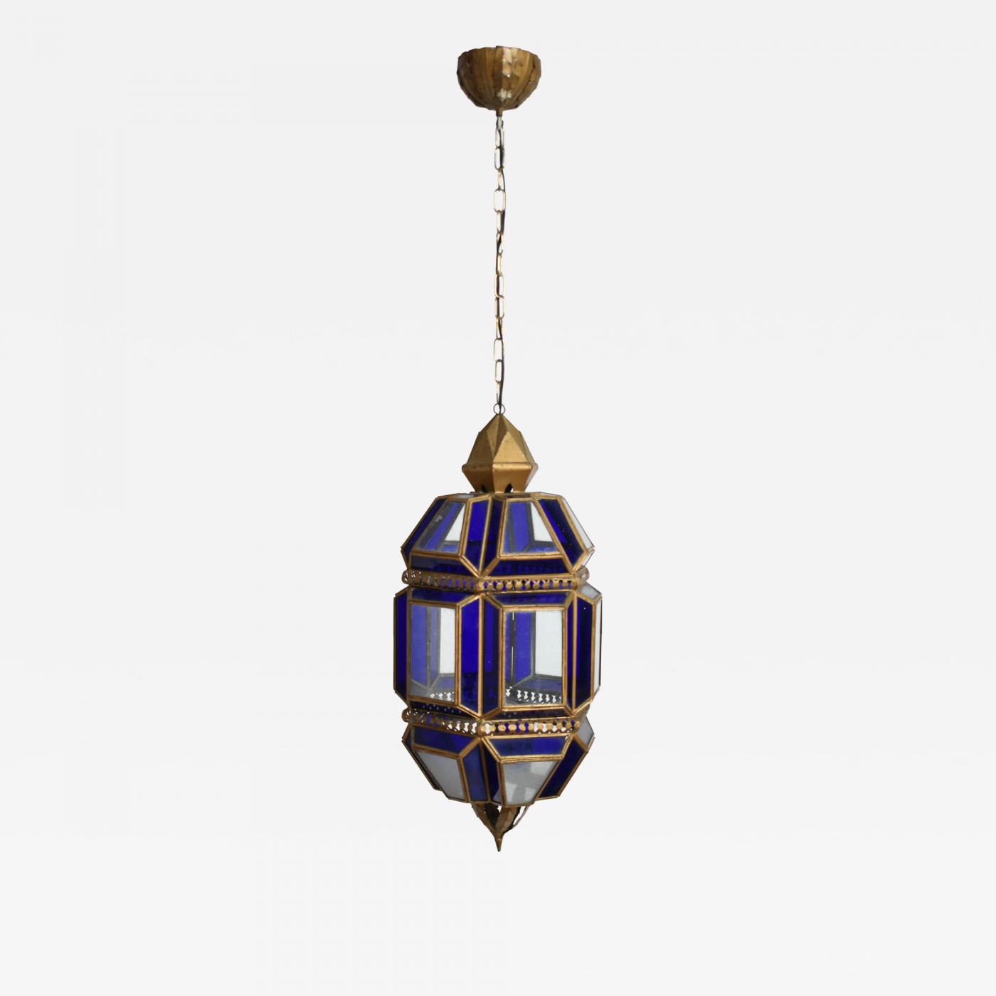 Brass and blue glass lantern ceiling lamp 1970s.