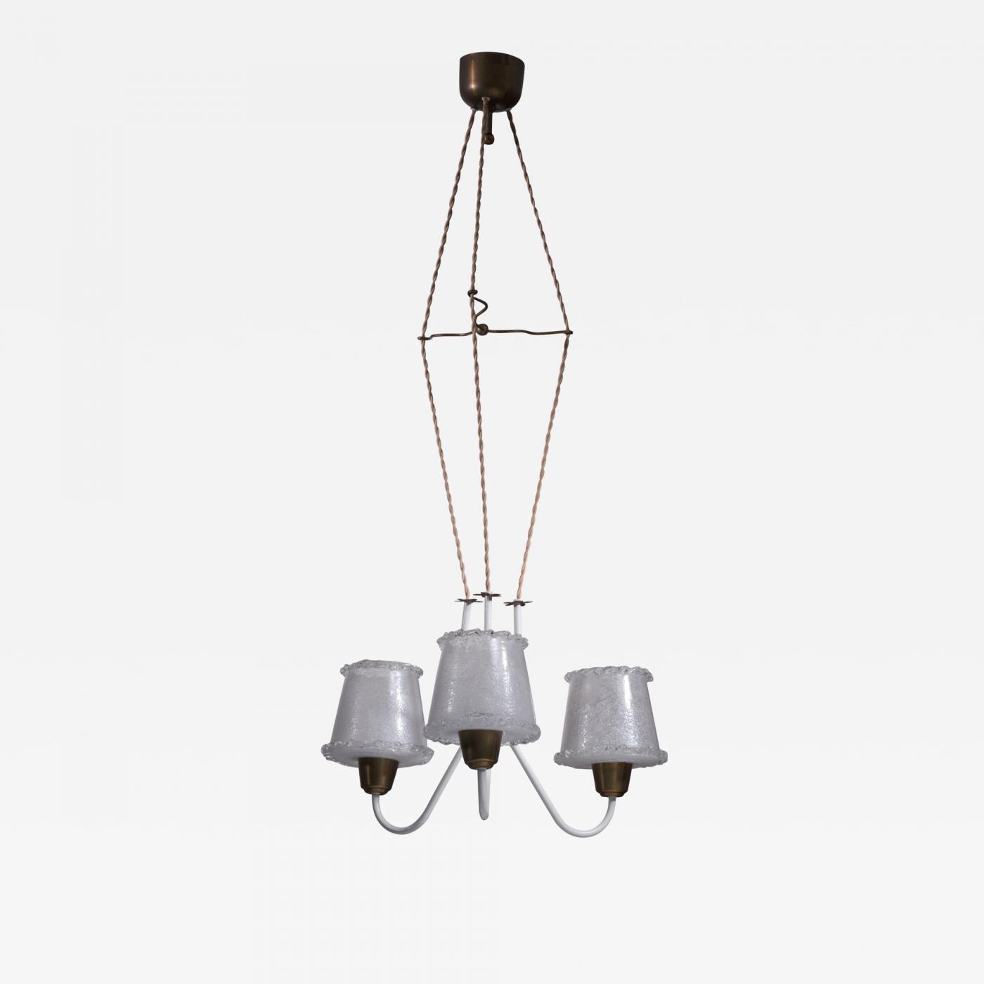 A Scandinavian Modern chandelier with three arms. It has a white lacquered metal frame with iced glass shades and brass star decorations.